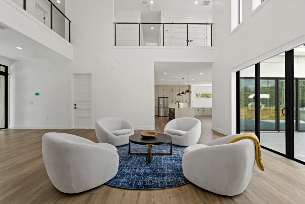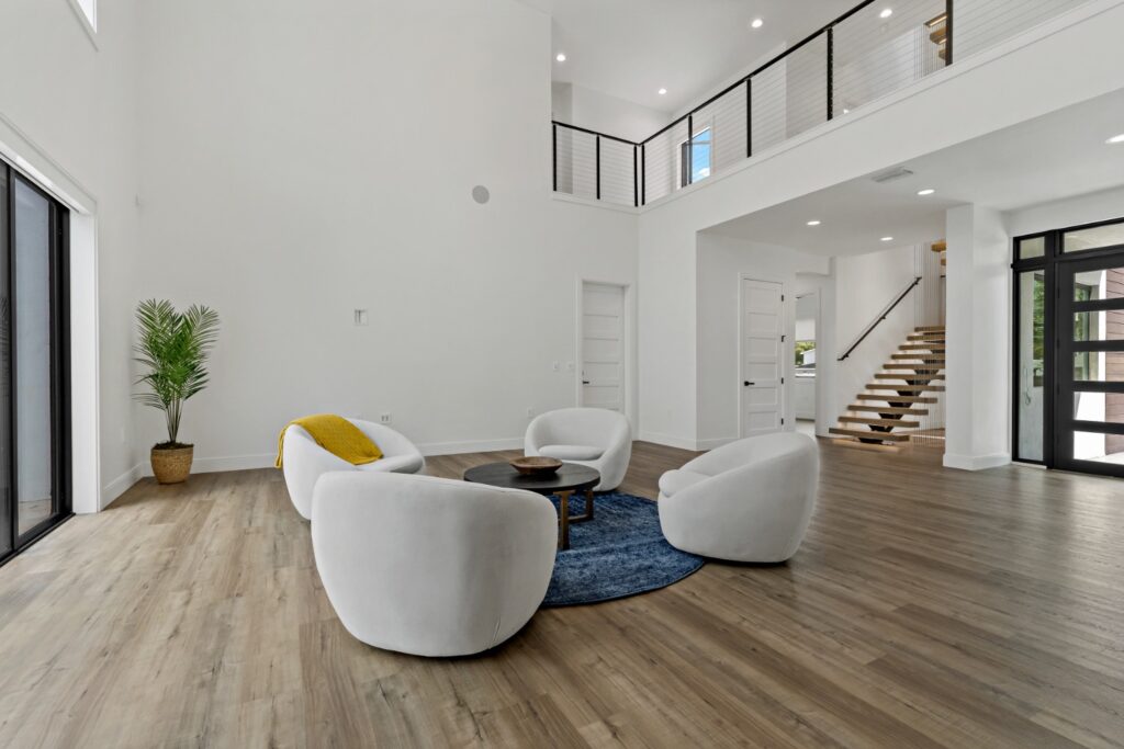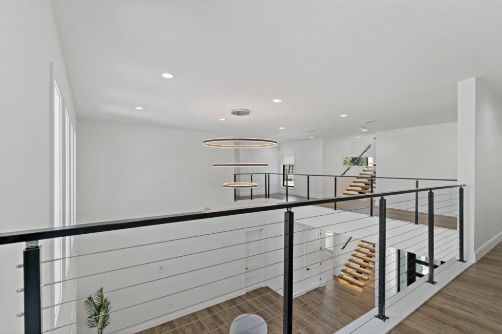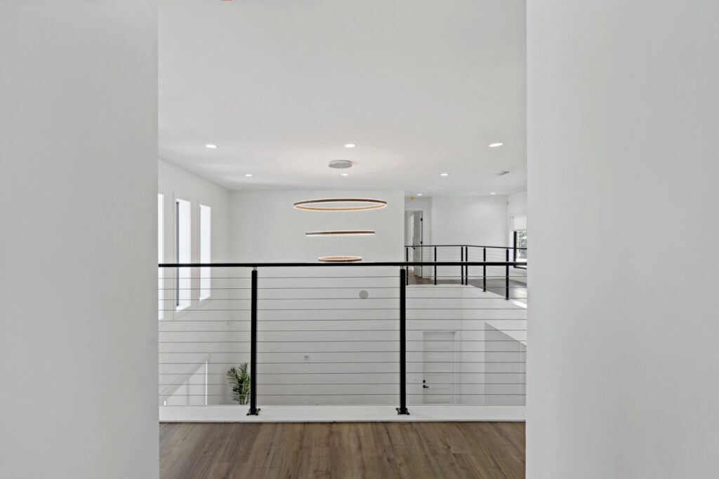 • Grand Living Spaces: The formal living room features a soaring 20.5-foot ceiling, with a second-floor hallway overlooking the space.