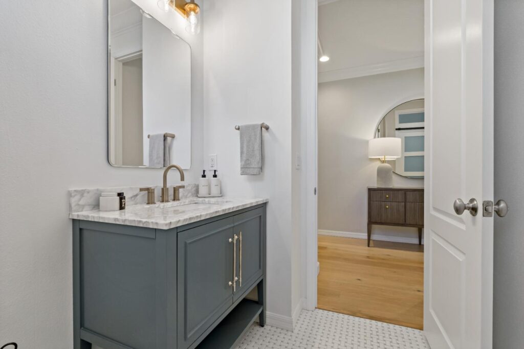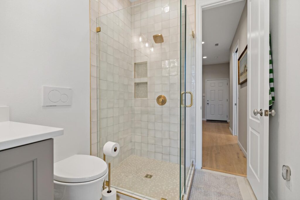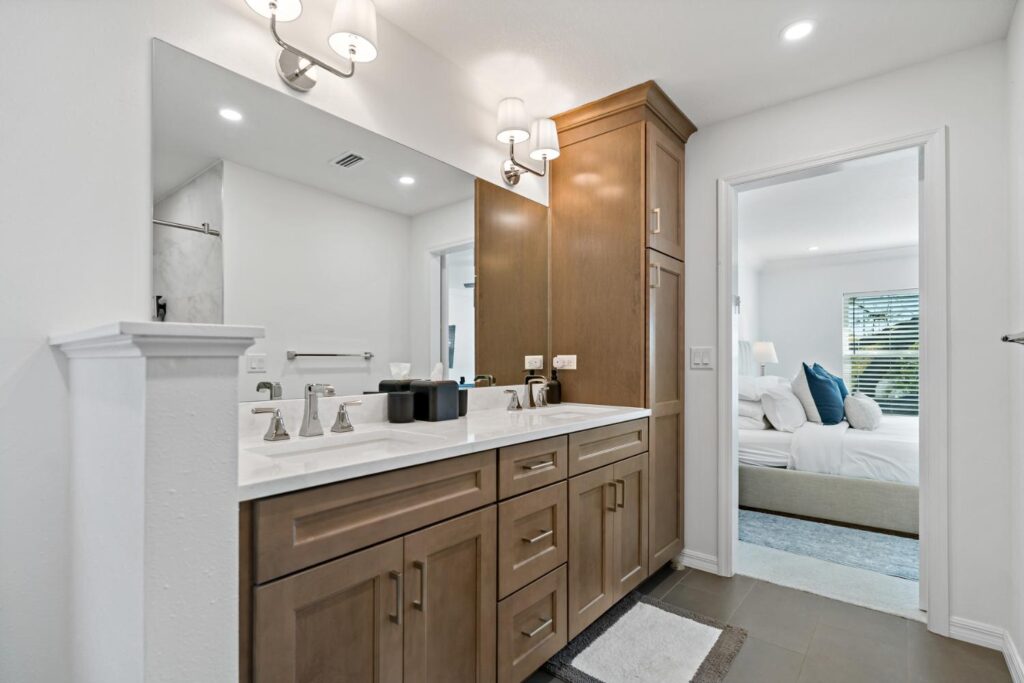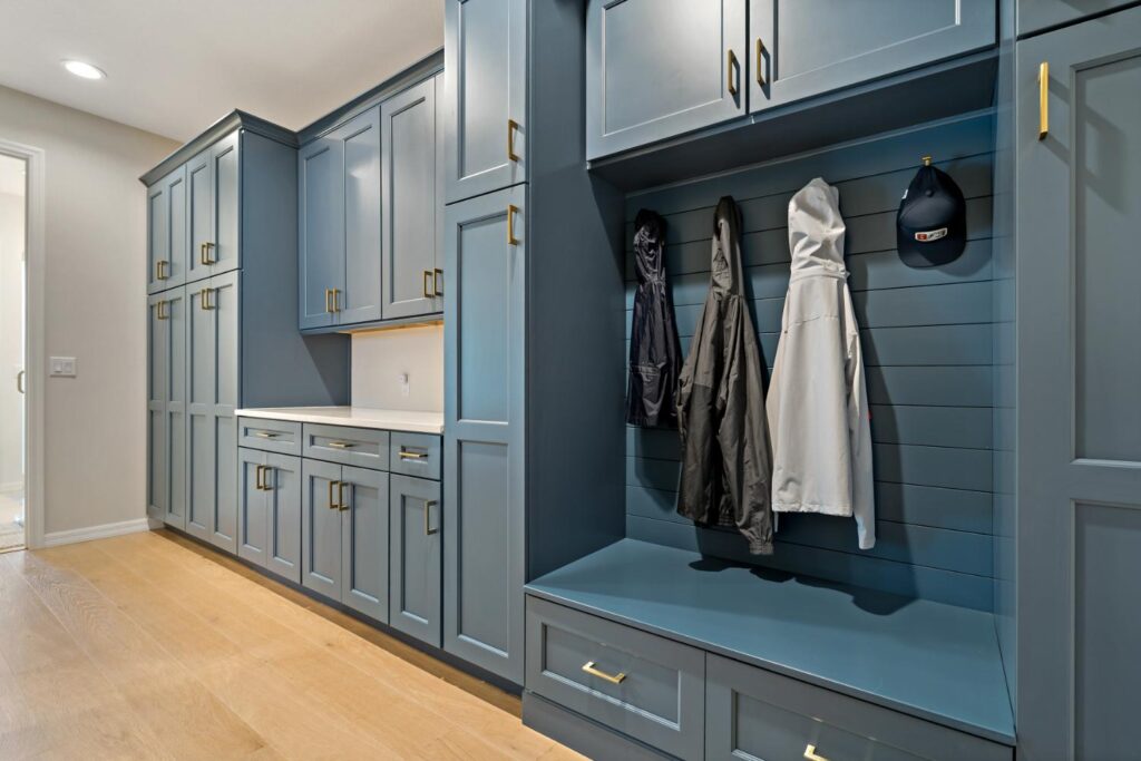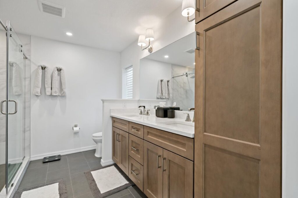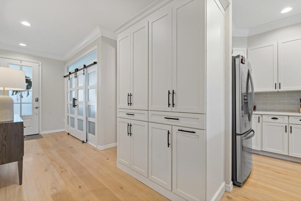 The remodel also included new flooring throughout, updated electrical and plumbing fixtures, and a refreshed kitchen with modern countertops. Floor-to-ceiling cabinetry was seamlessly added to match the existing design, providing enhanced pantry storage.