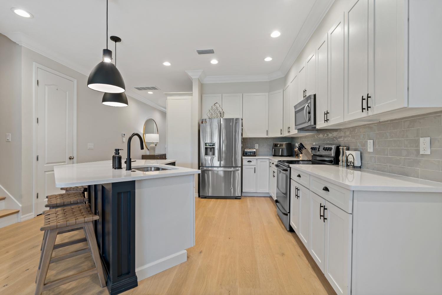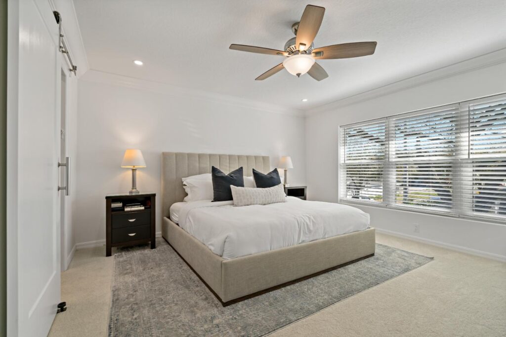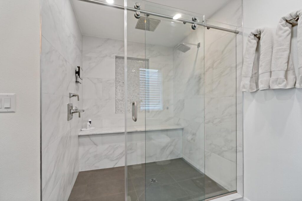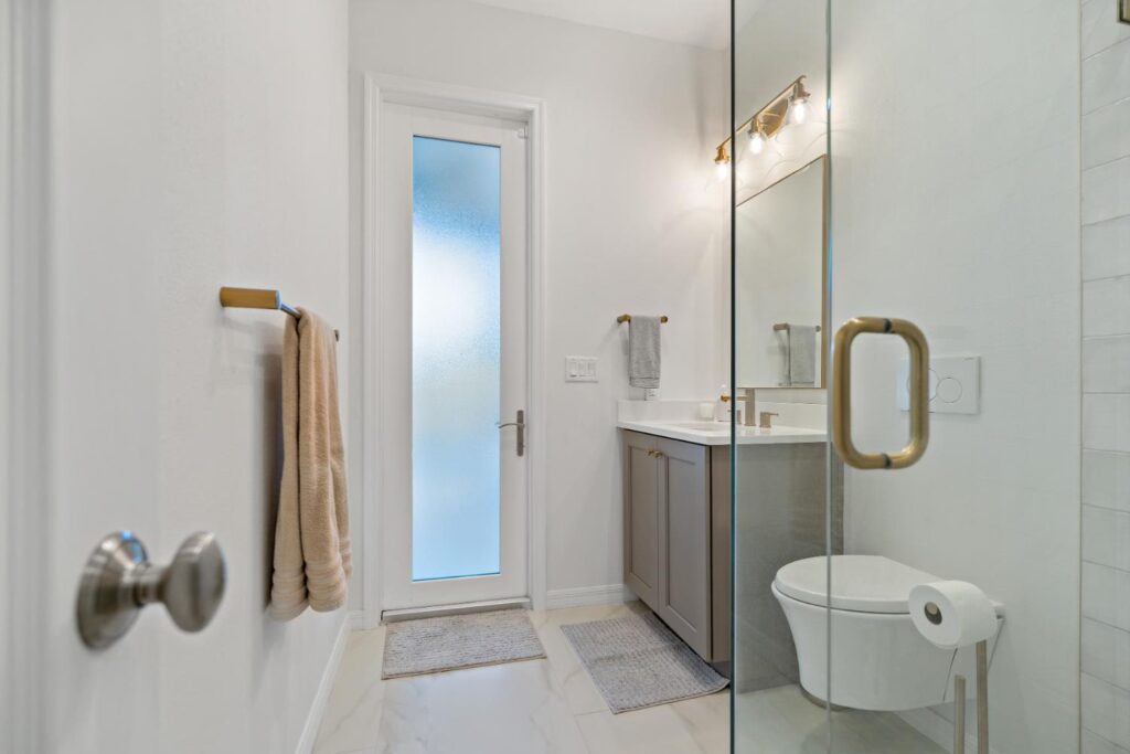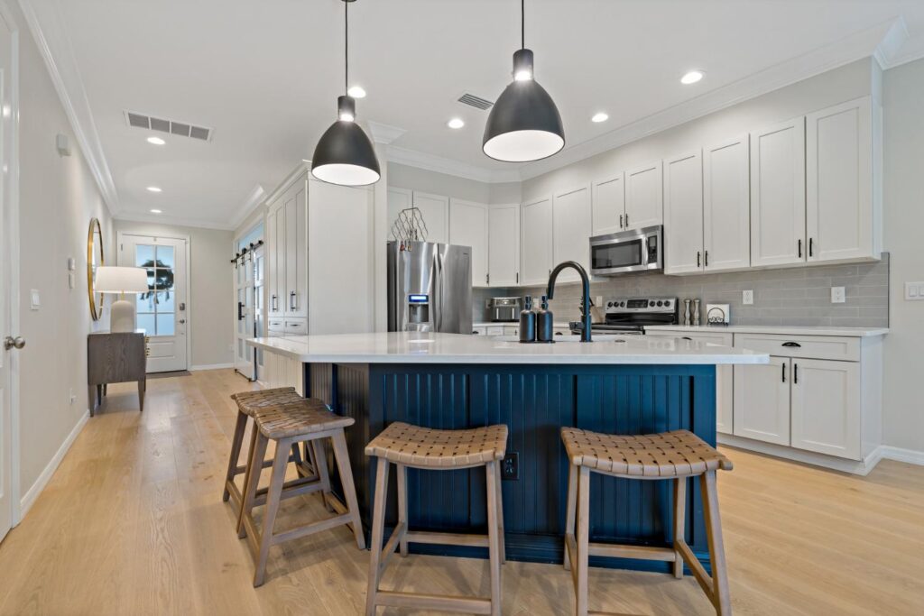 The remodel also included new flooring throughout, updated electrical and plumbing fixtures, and a refreshed kitchen with modern countertops. Floor-to-ceiling cabinetry was seamlessly added to match the existing design, providing enhanced pantry storage.