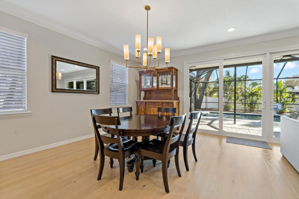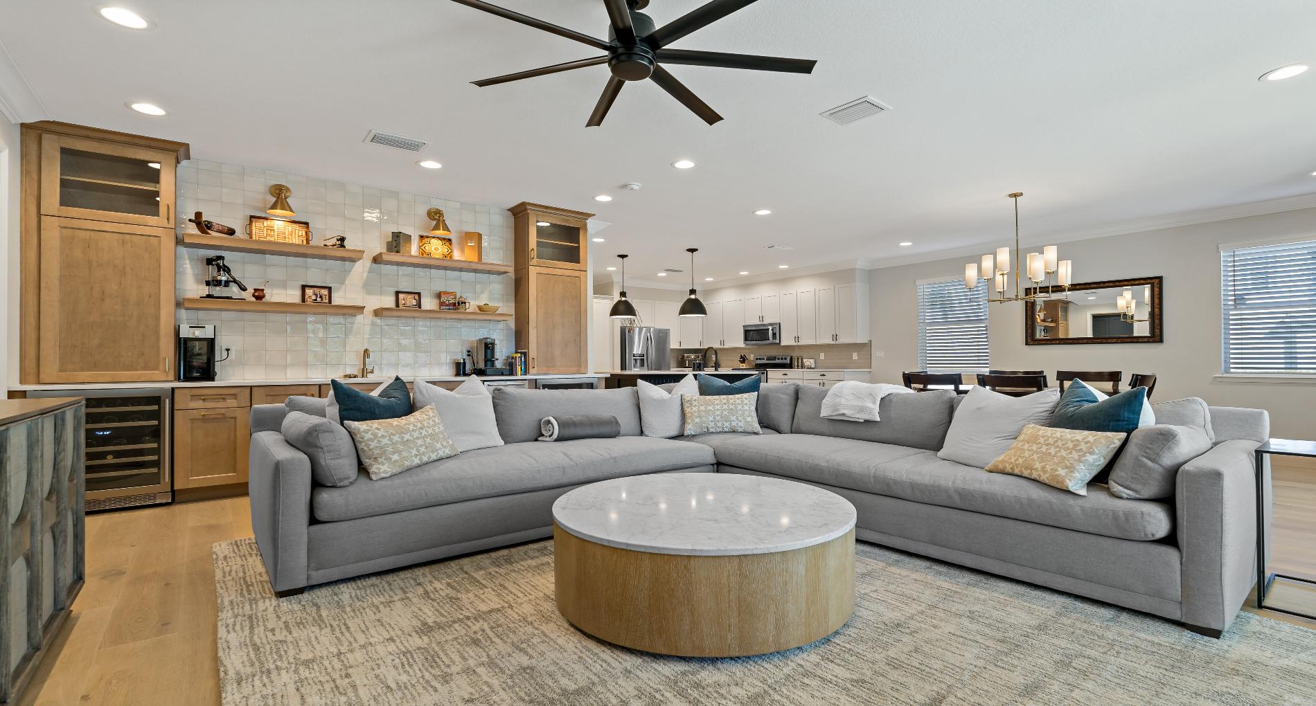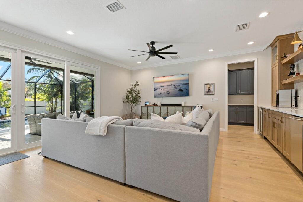 • Indoor-Outdoor Living: Expansive sliding doors along the back wall flood the home with natural light and showcase the pool and outdoor living area.