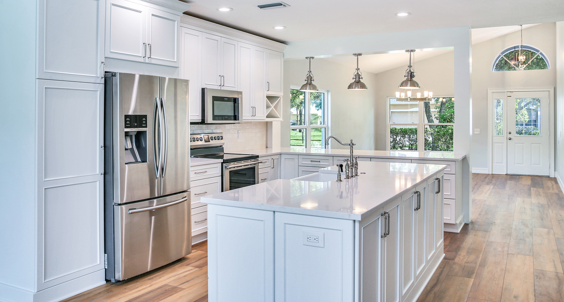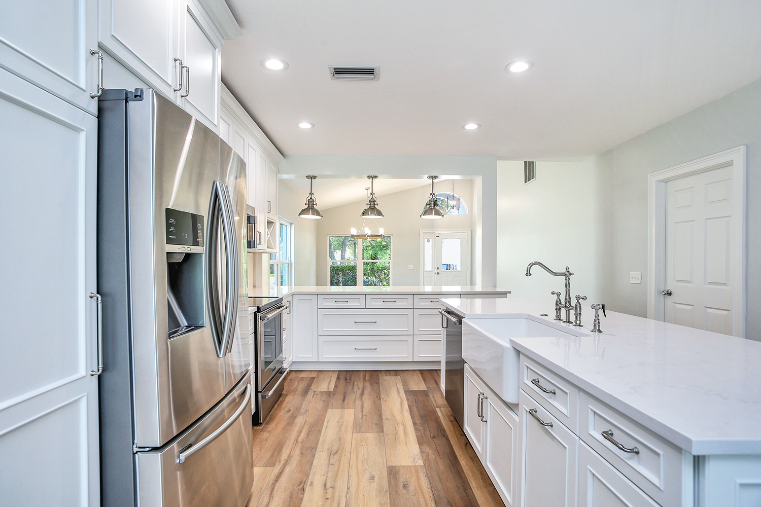 • Modern Gourmet Kitchen: The kitchen was relocated to maximize functionality and interaction with the main living spaces.