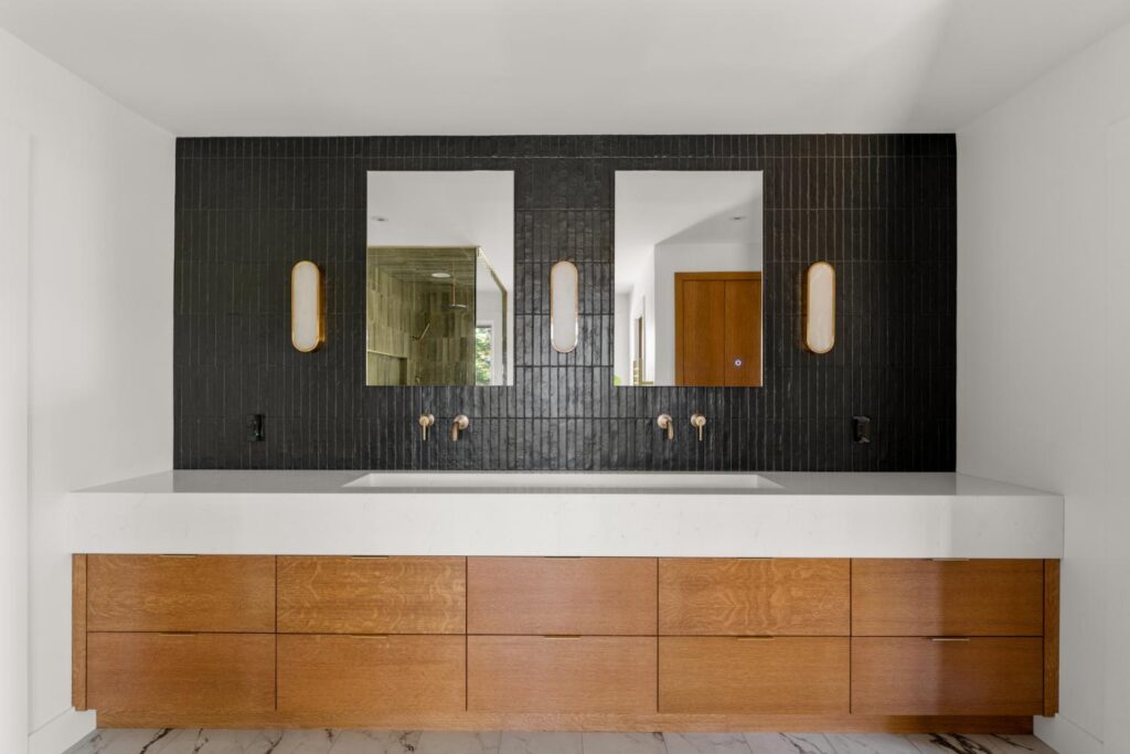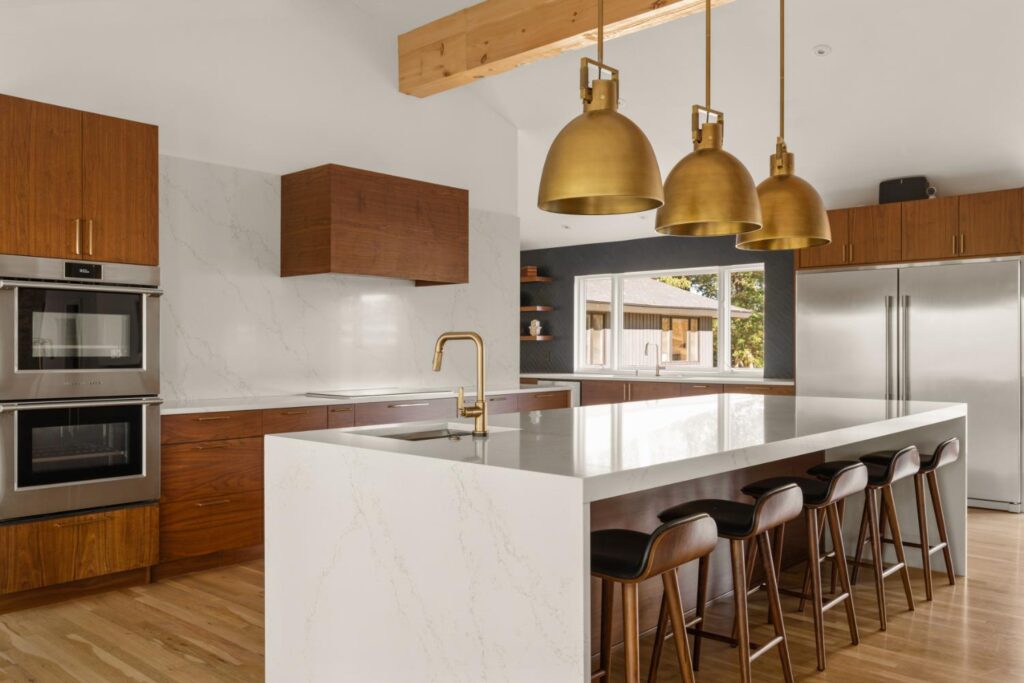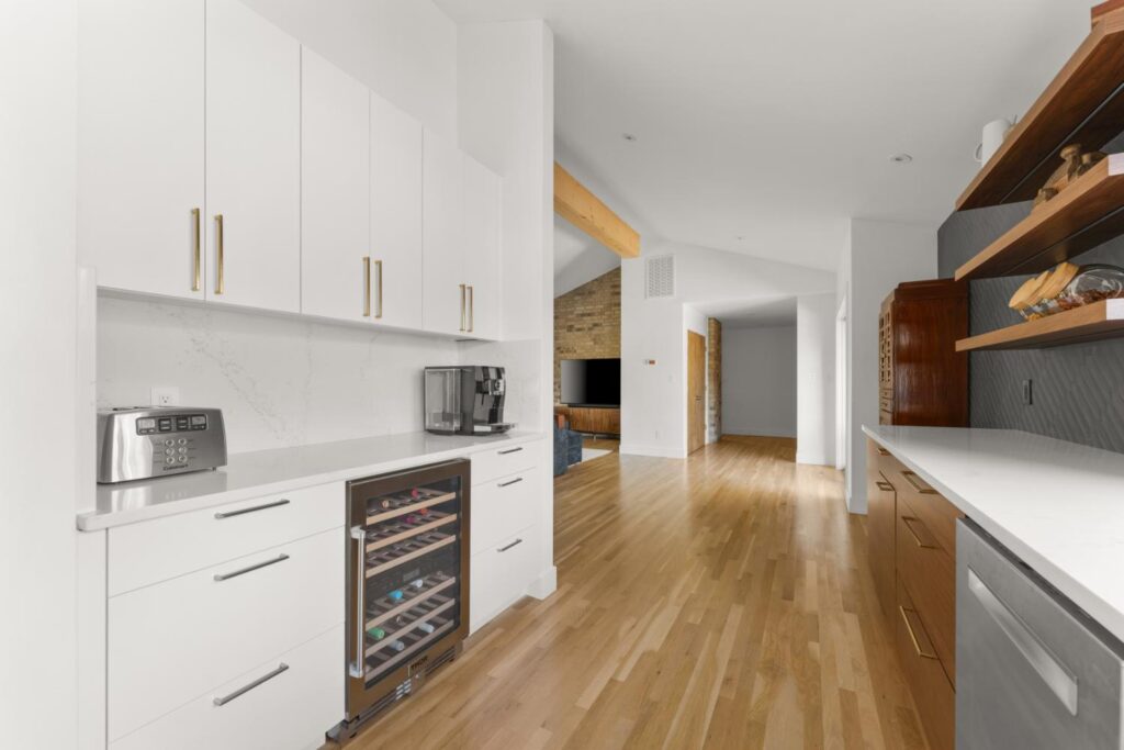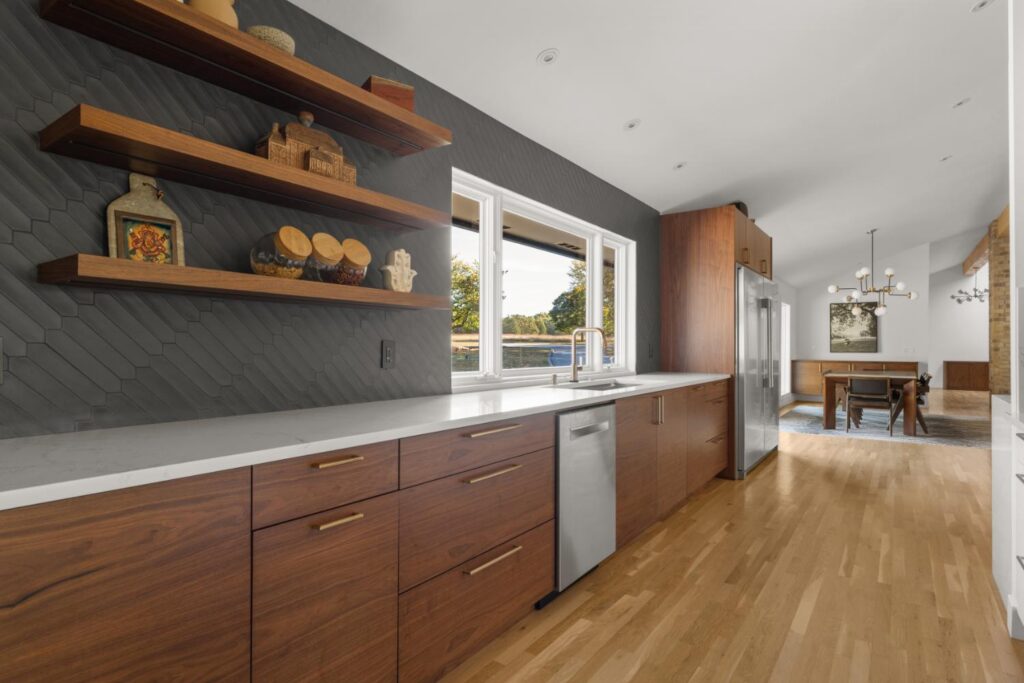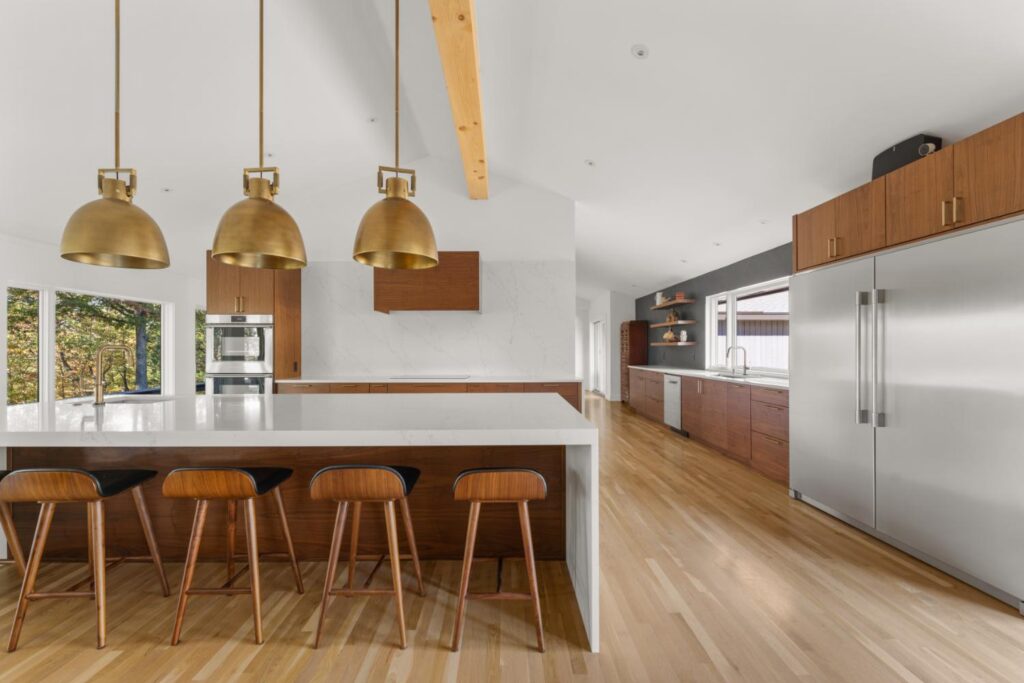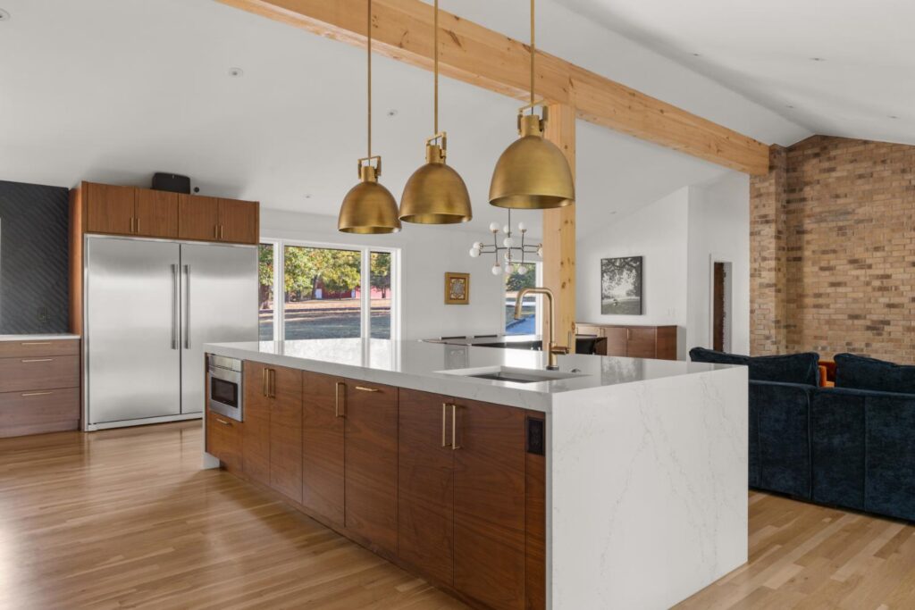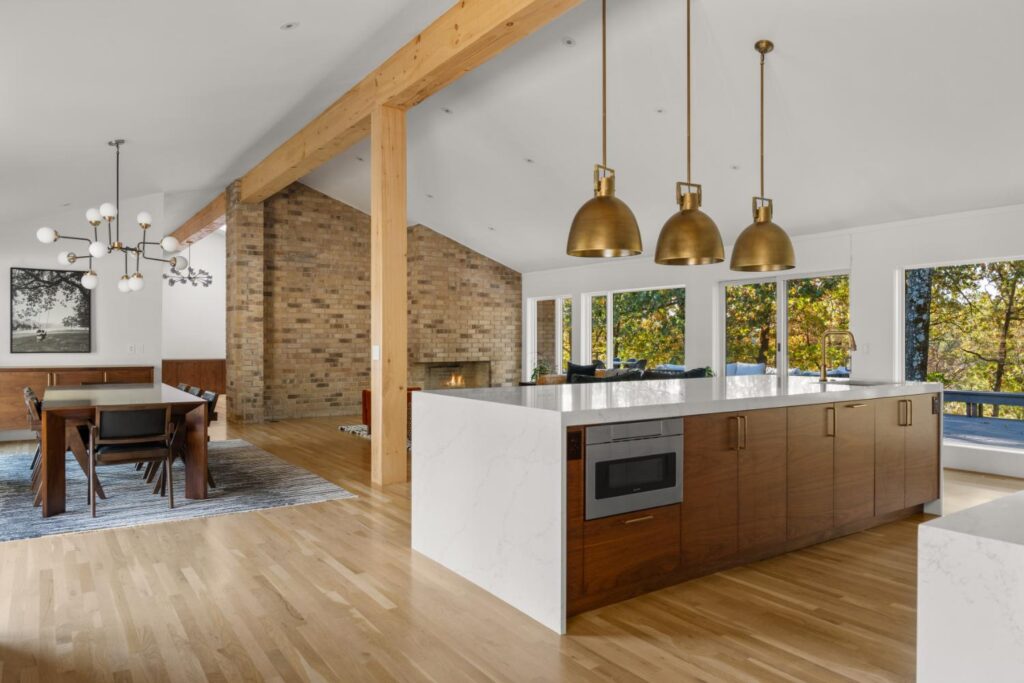 Complete update of 1980’s modern home creating open floor plan with vaulted ceilings and updated living spaces.