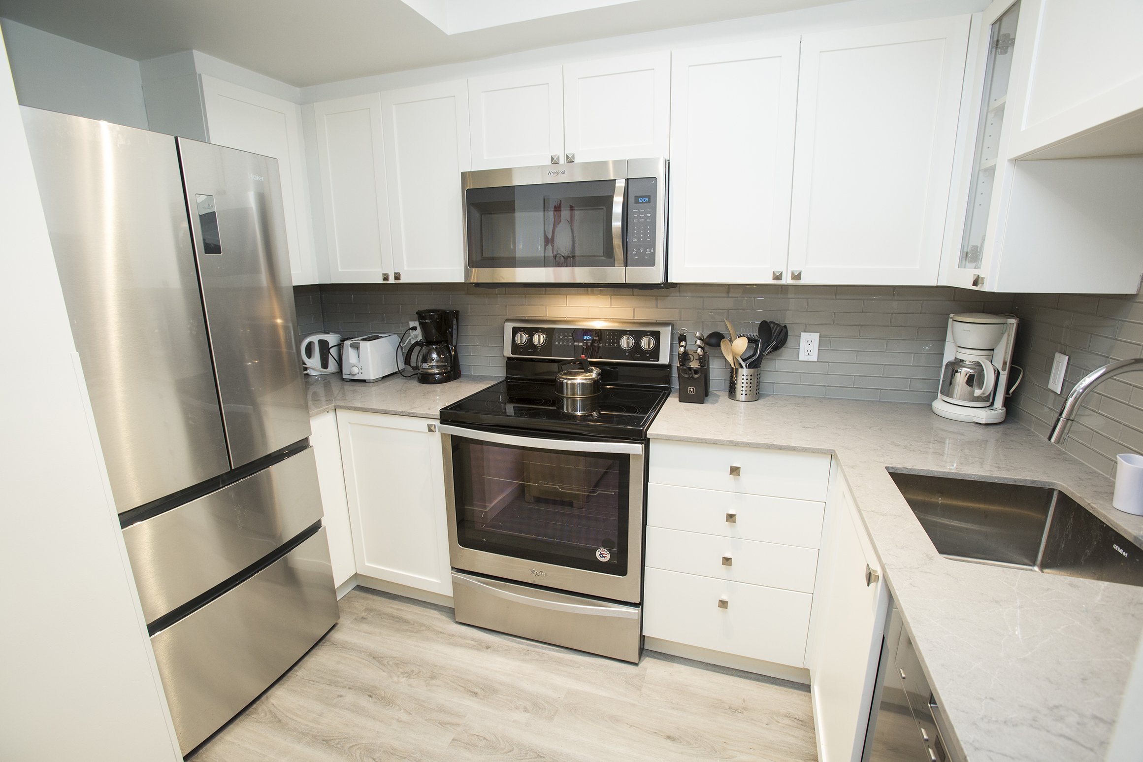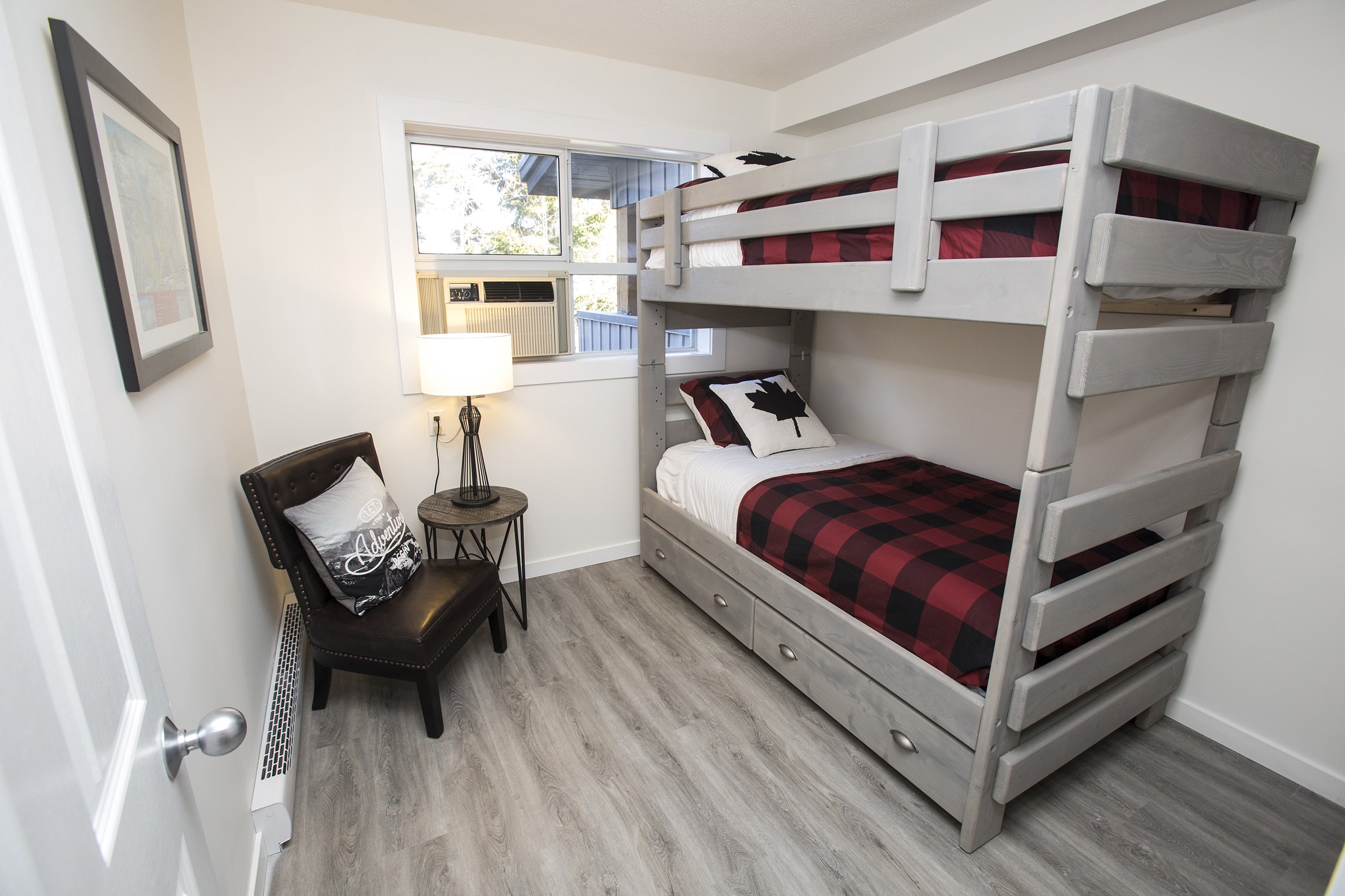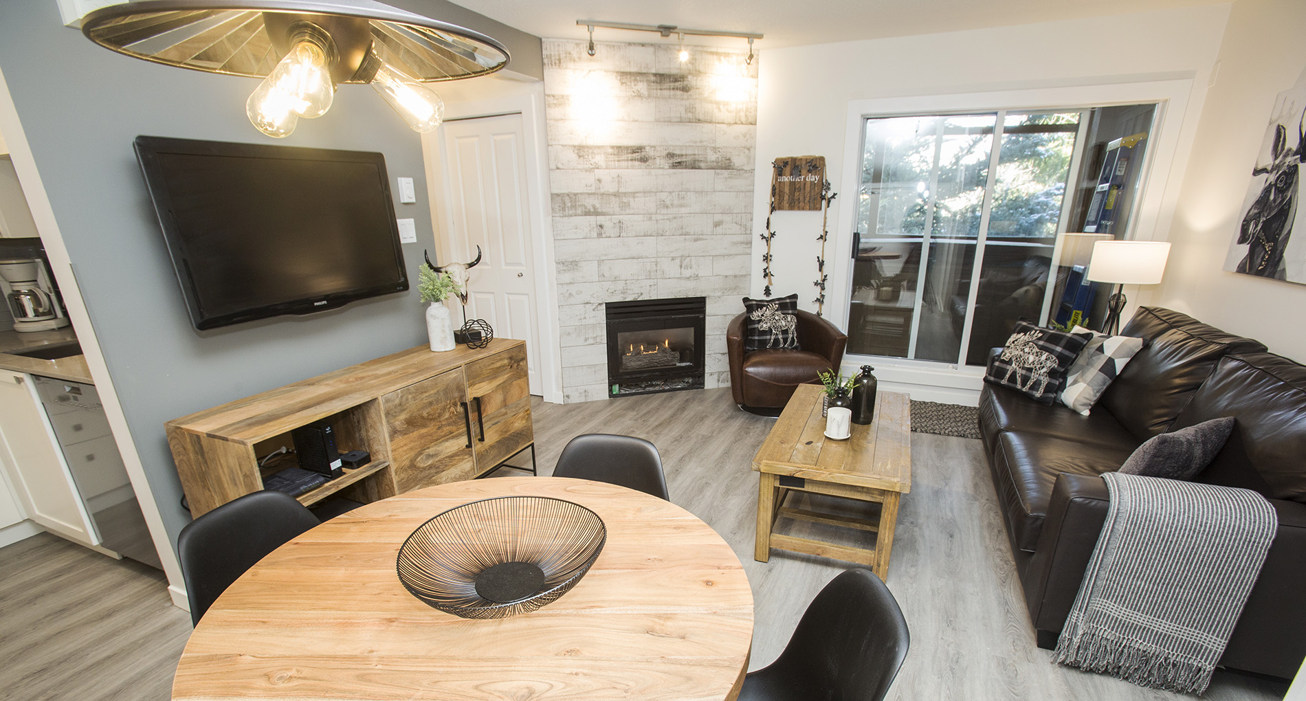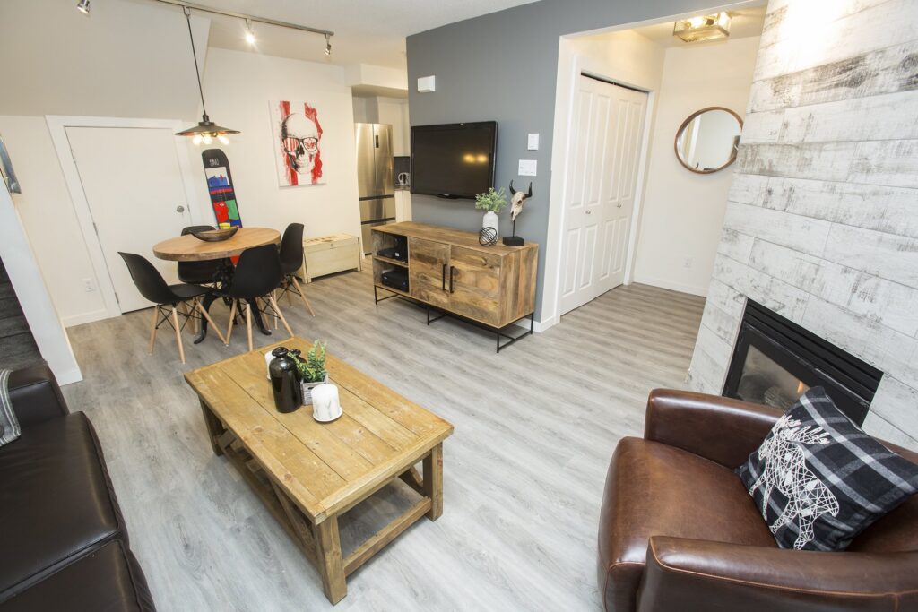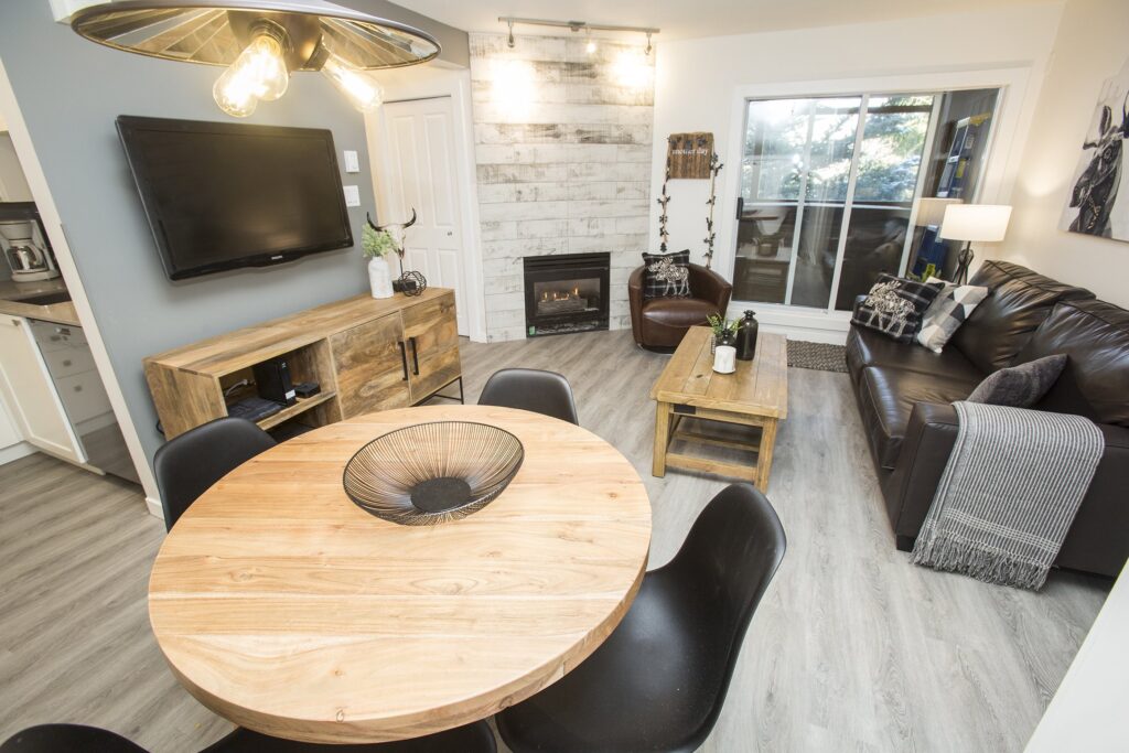 A fresh look on a classic Whistler condo. New flooring, paint and trim throughout. New counters and plumbing fixtures in the kitchen and bathroom while refinishing the existing cabinets instead of replacing them. New tile backsplash and fireplace surround with additional lighting throughout to really brighten up the unit.