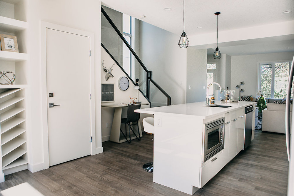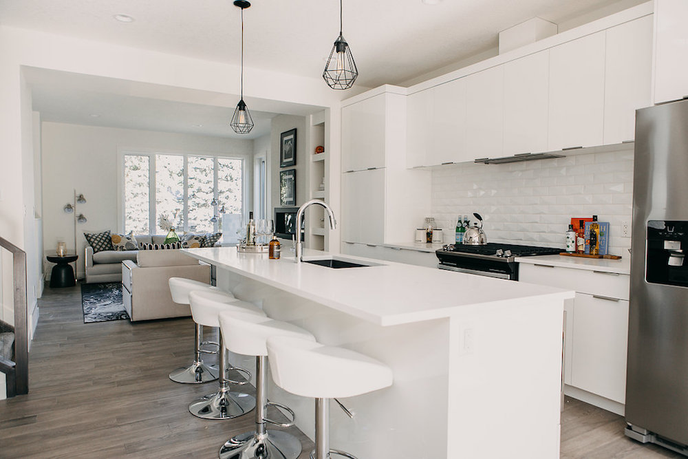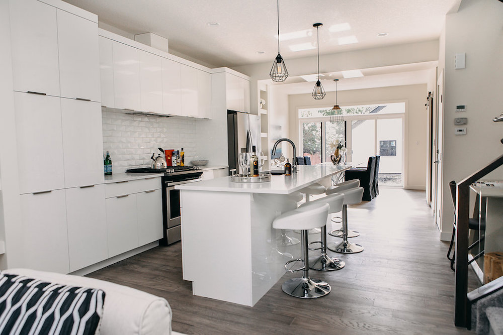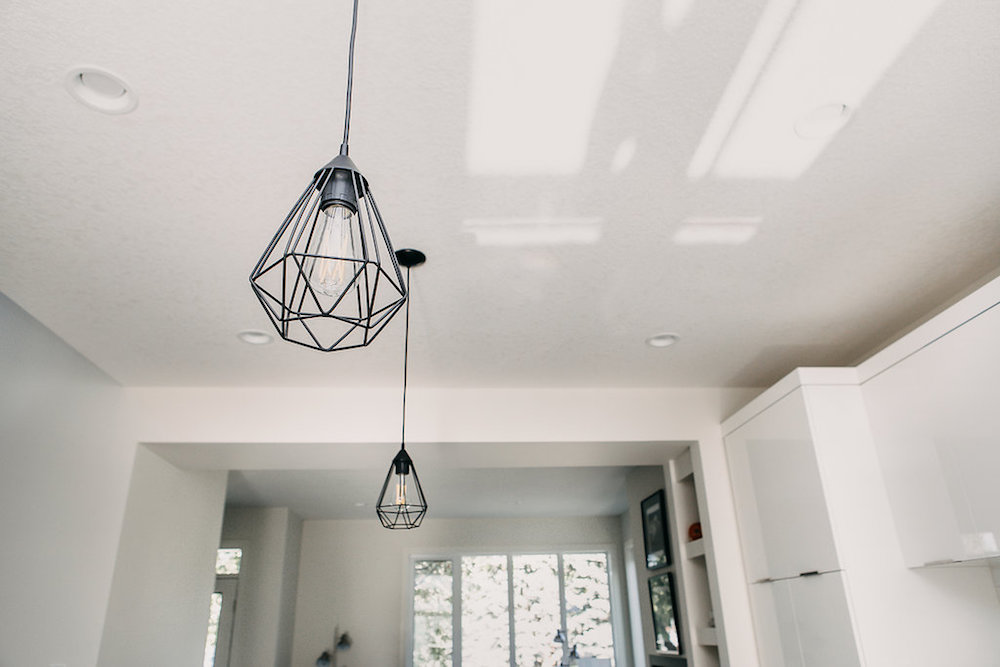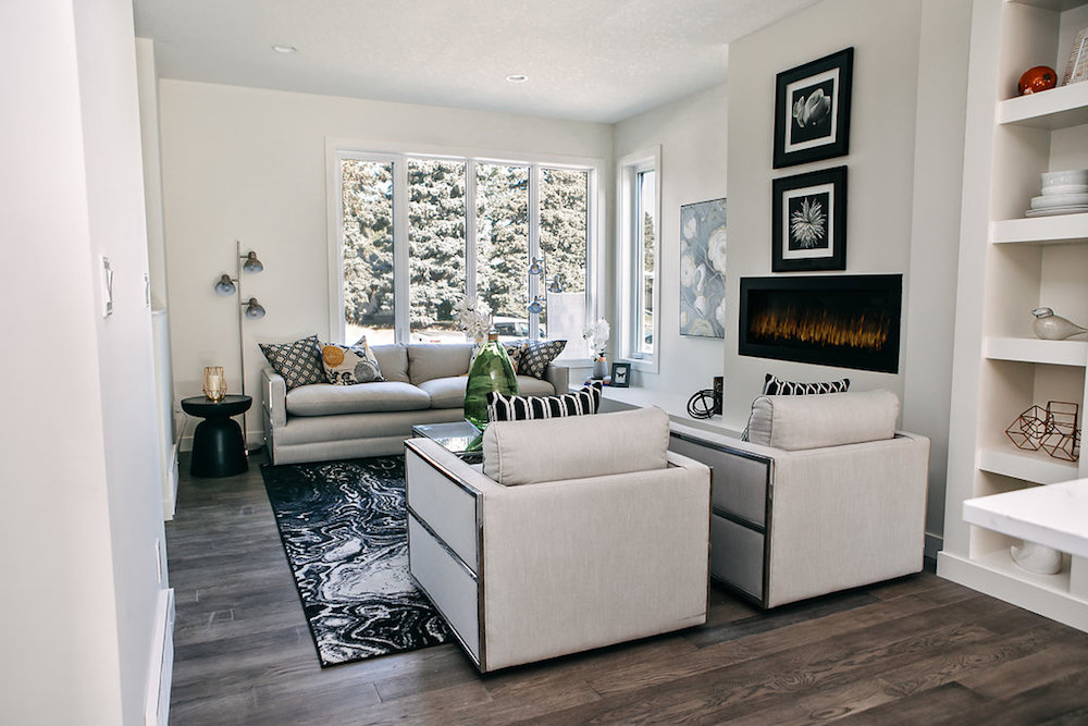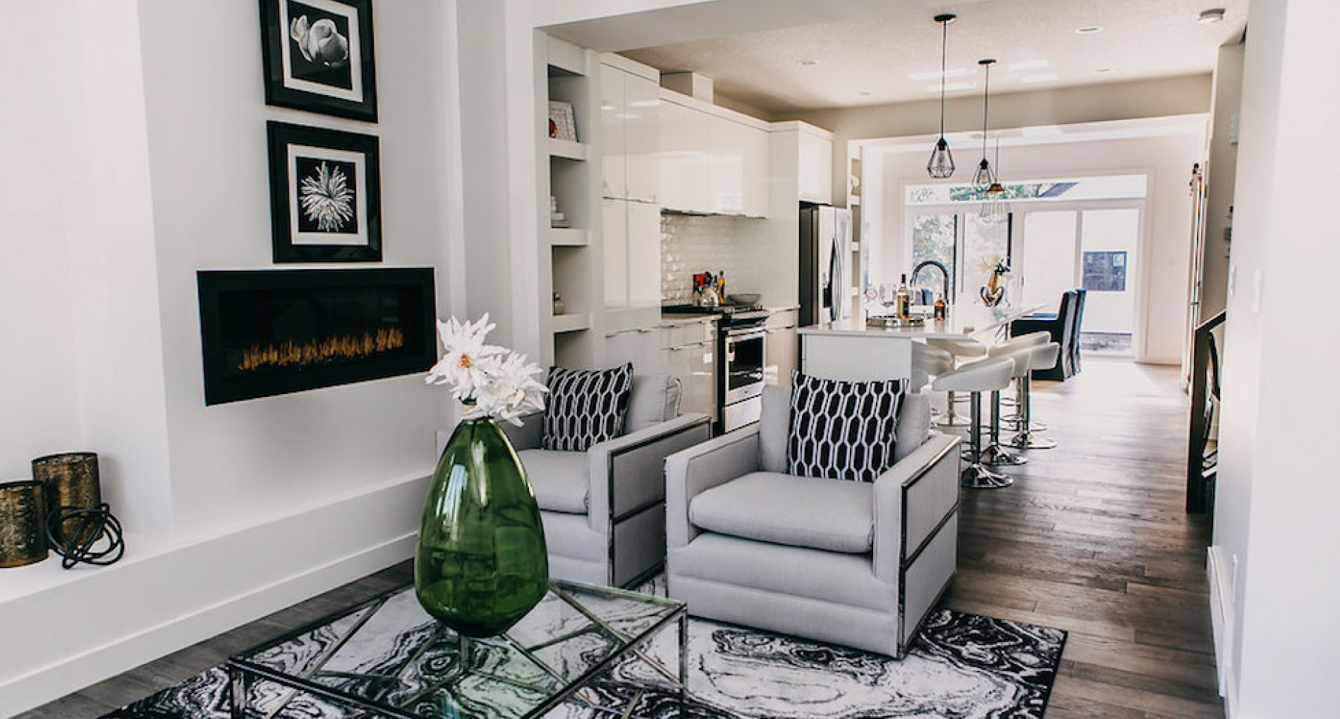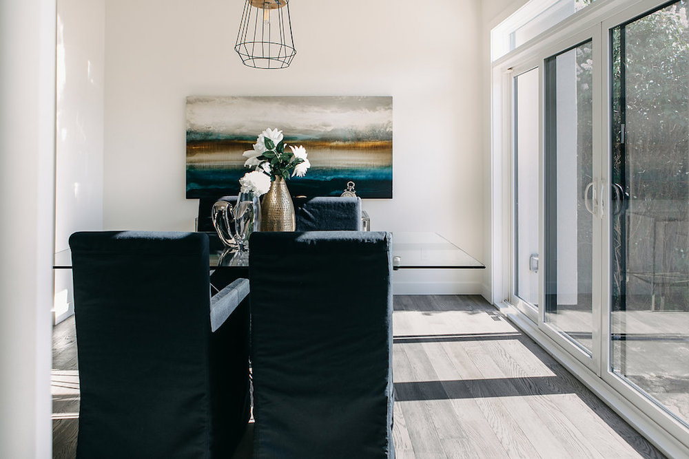 This custom home features an open concept layout, high-end finishes, and hardwood floors throughout. Unique lighting fixtures and glass tables give the space a modern and elegant feel.