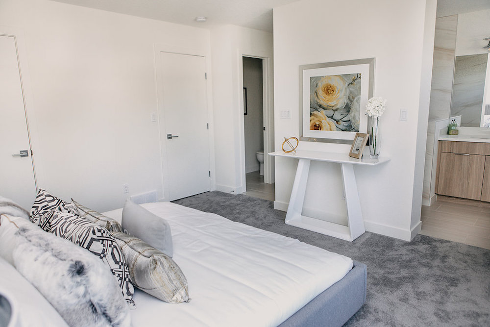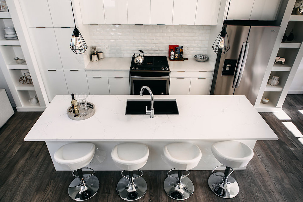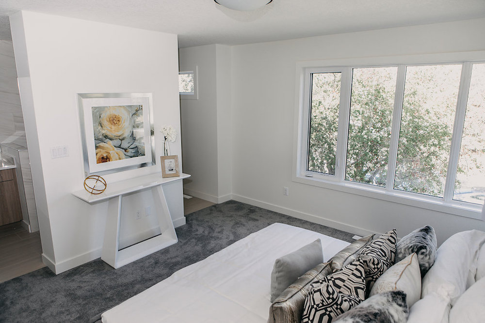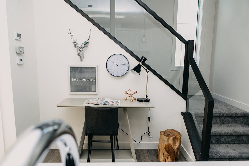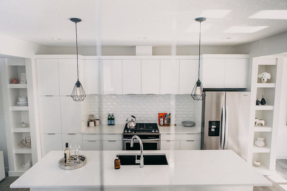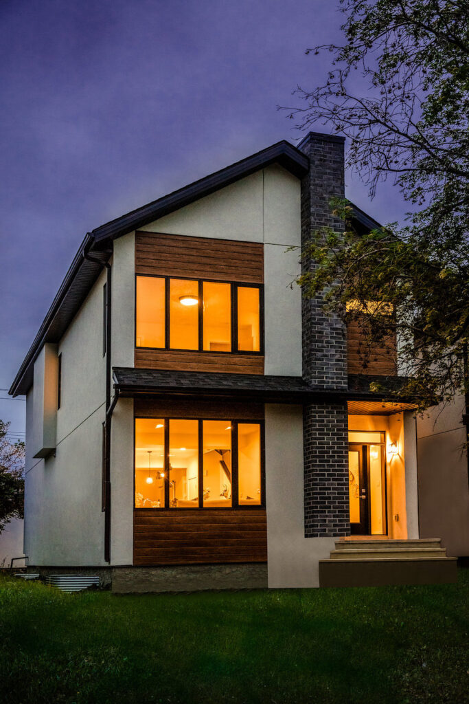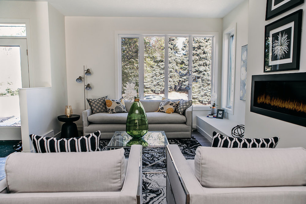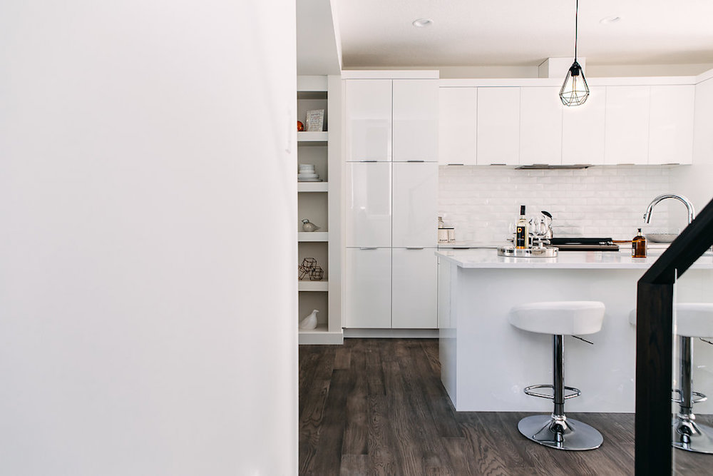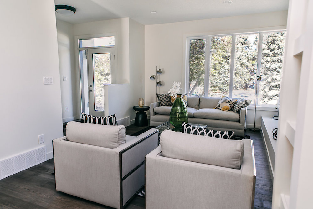 This custom home features an open concept layout, high-end finishes, and hardwood floors throughout. Unique lighting fixtures and glass tables give the space a modern and elegant feel.