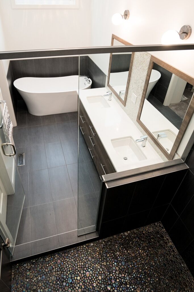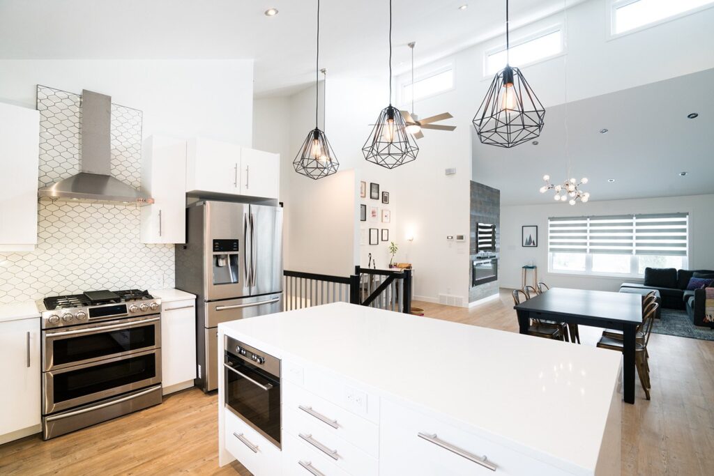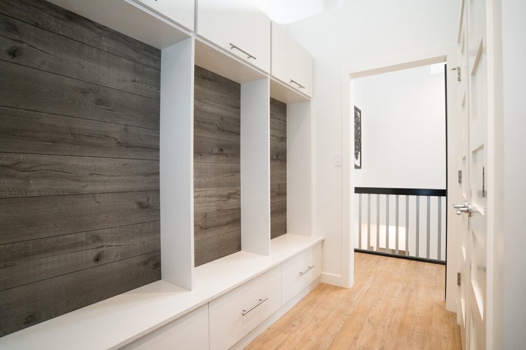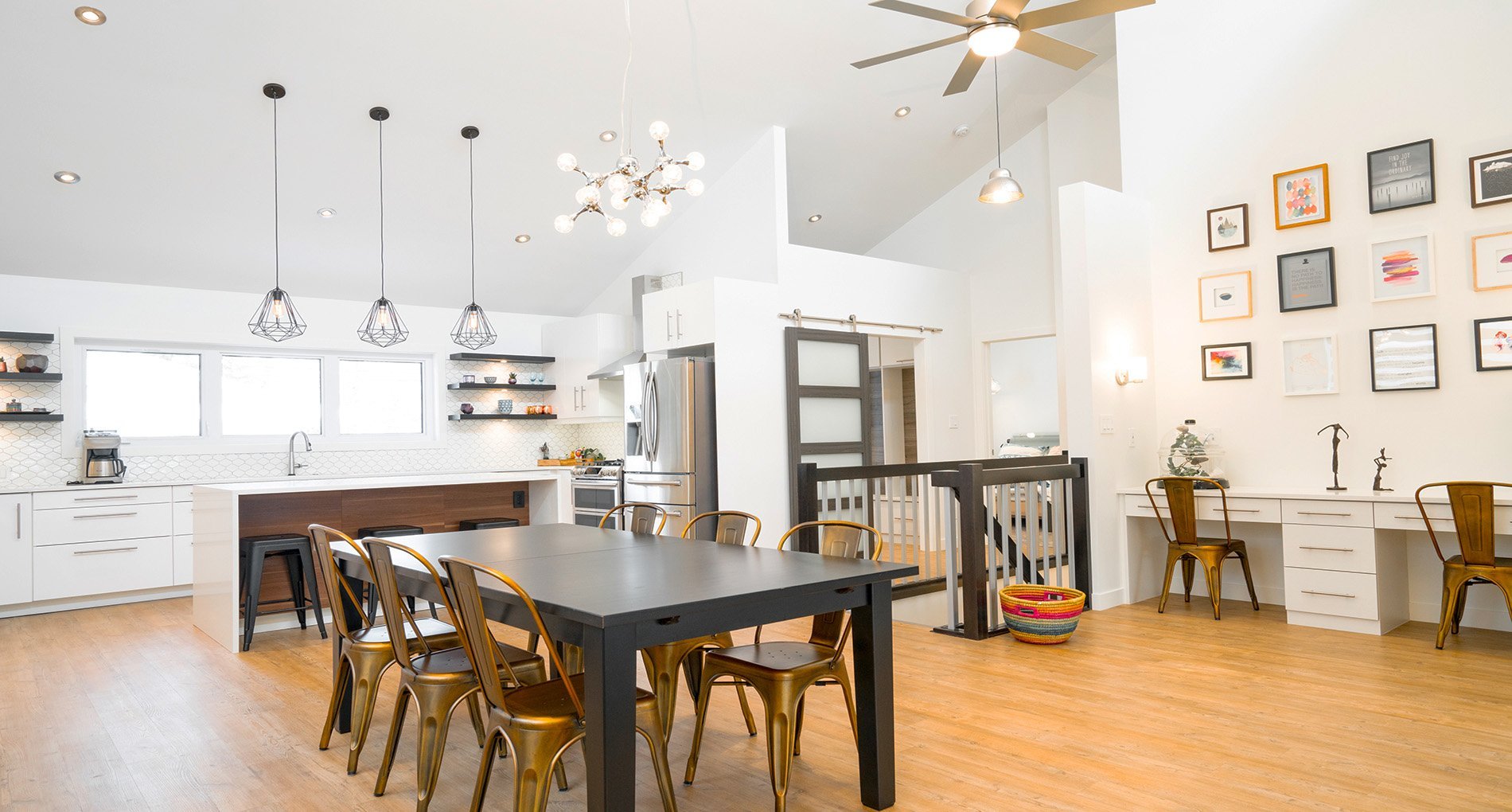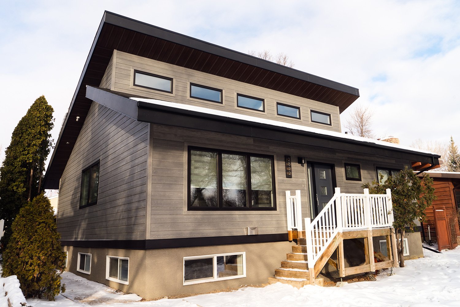 This mid-century family home has been completely renovated into a modern and contemporary space. The home features a new kitchen, updated living room and a customized mudroom area.