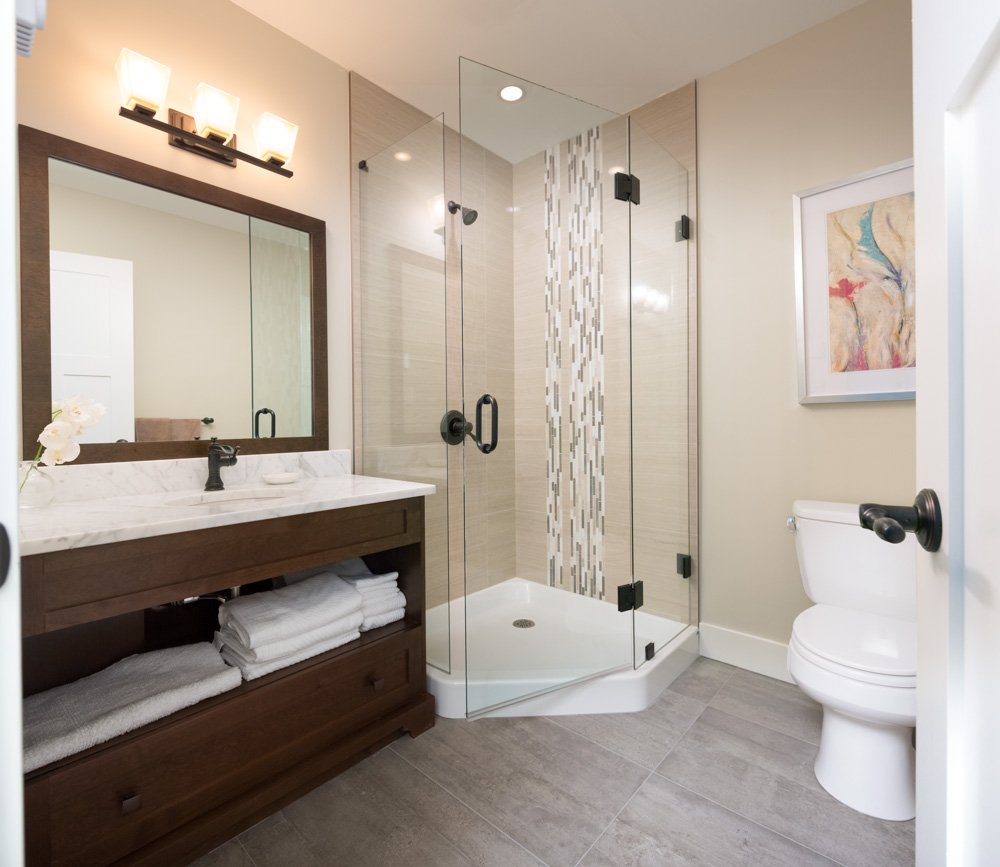 The master bathroom features granite double vanity, porcelain tile with glass mosaic tile accent and bench, and a freestanding soaker tub.