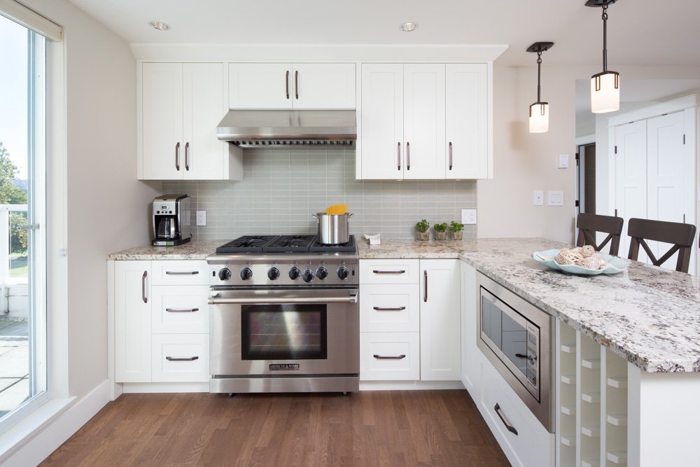 The kitchen features granite countertops, glass tile backsplash, high-end stainless steel appliances, and custom features such as a built-in wine rack.