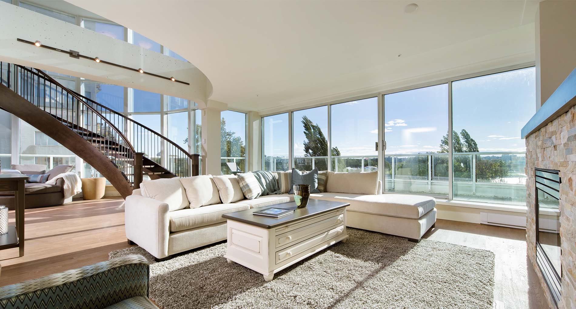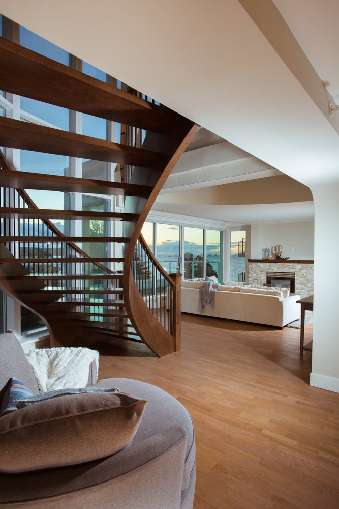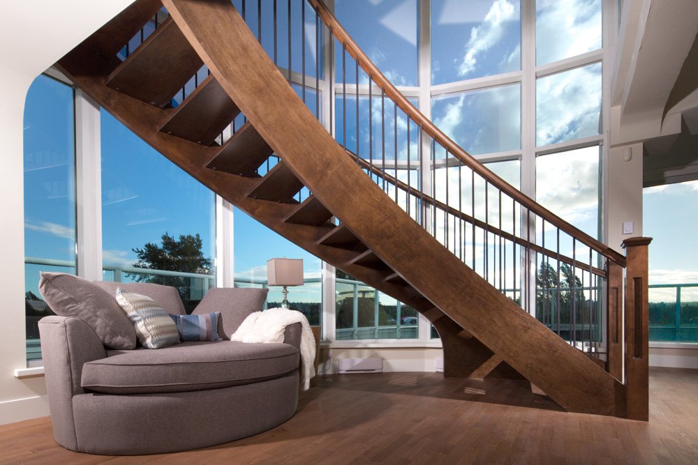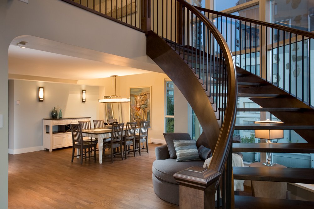 Complete condo penthouse renovation. The kitchen and bathrooms were relocated, new curved staircase and new patio access doors were created in a concrete tower building. Condo was completely transformed from closed-in and outdated to spectacular and modern.