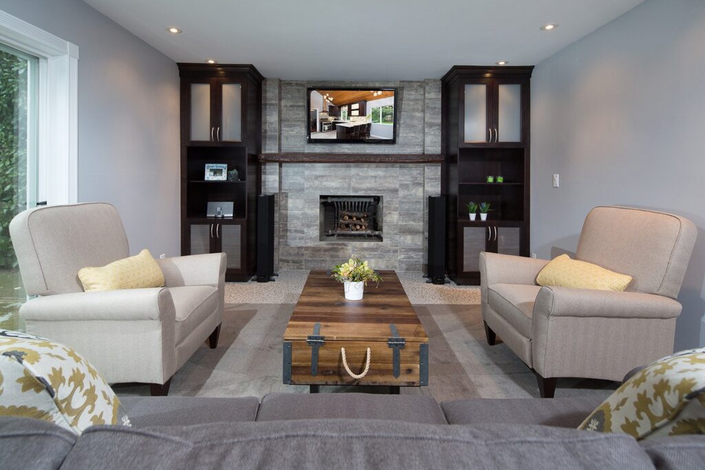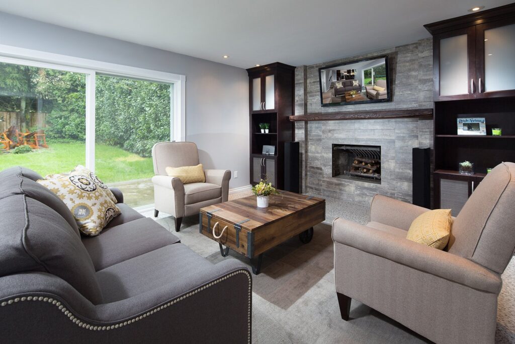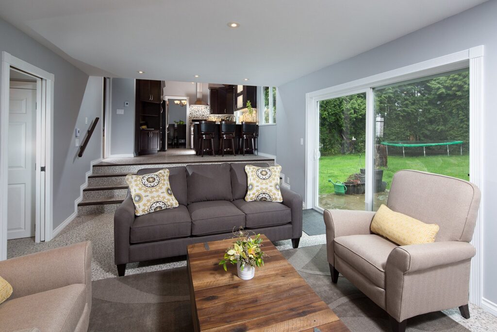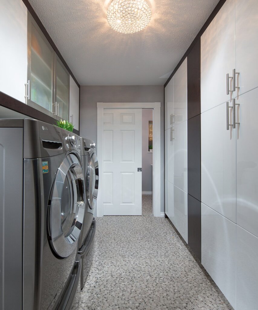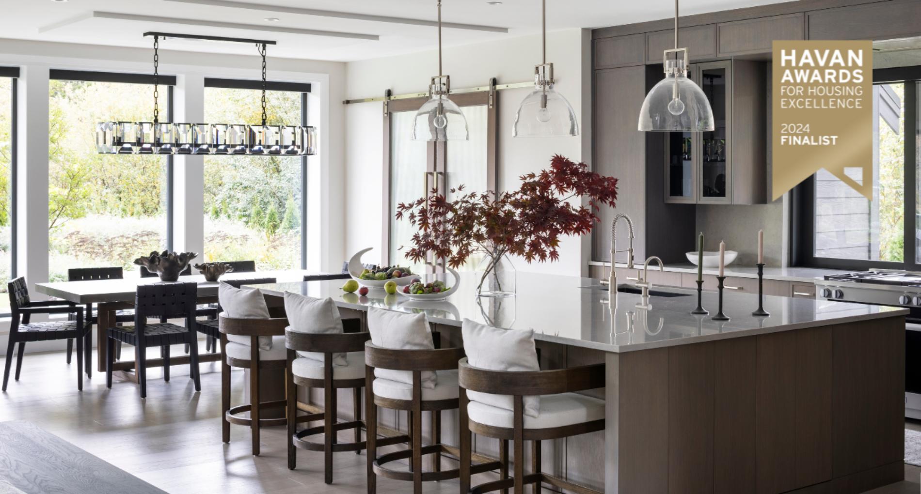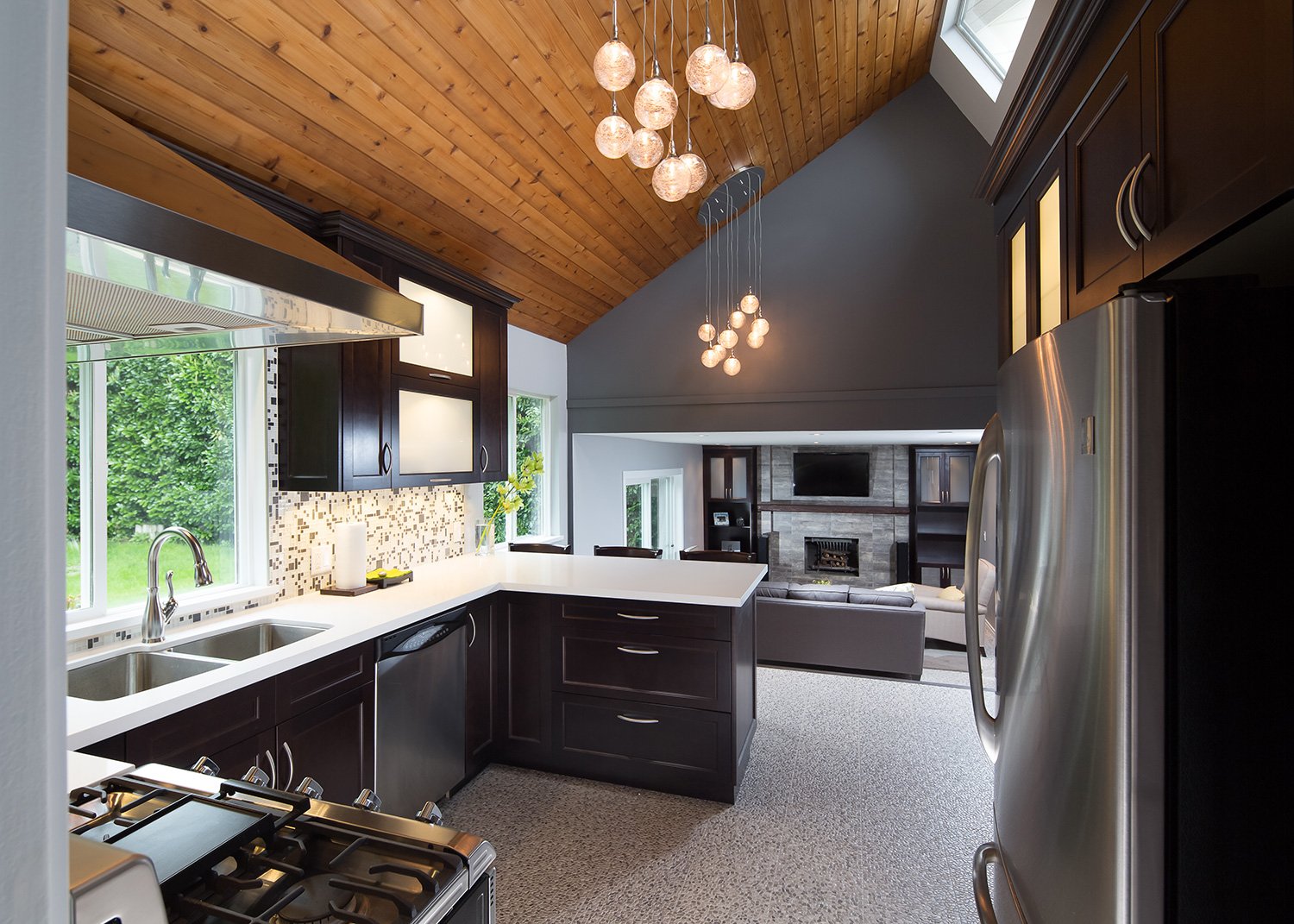 This renovation features a modern and functional update to the kitchen and sunken family room, laundry room, and powder room.