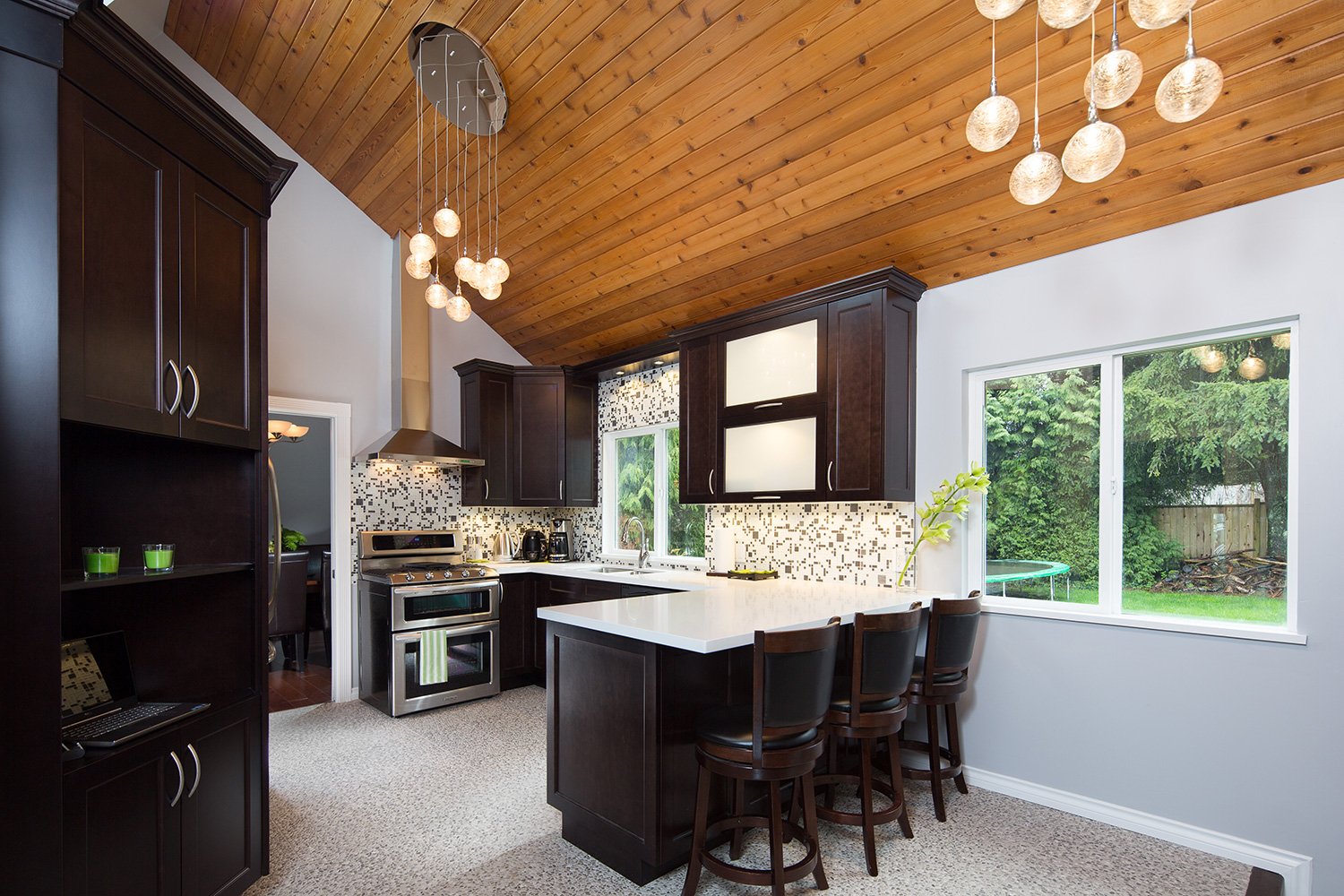 The kitchen features an angled wood ceiling, custom cabinetry, and tile flooring.