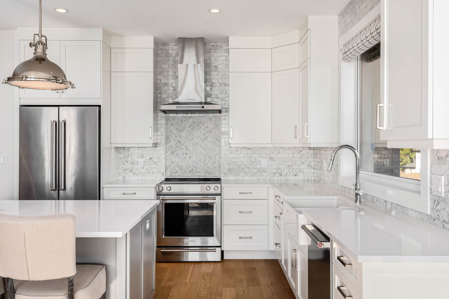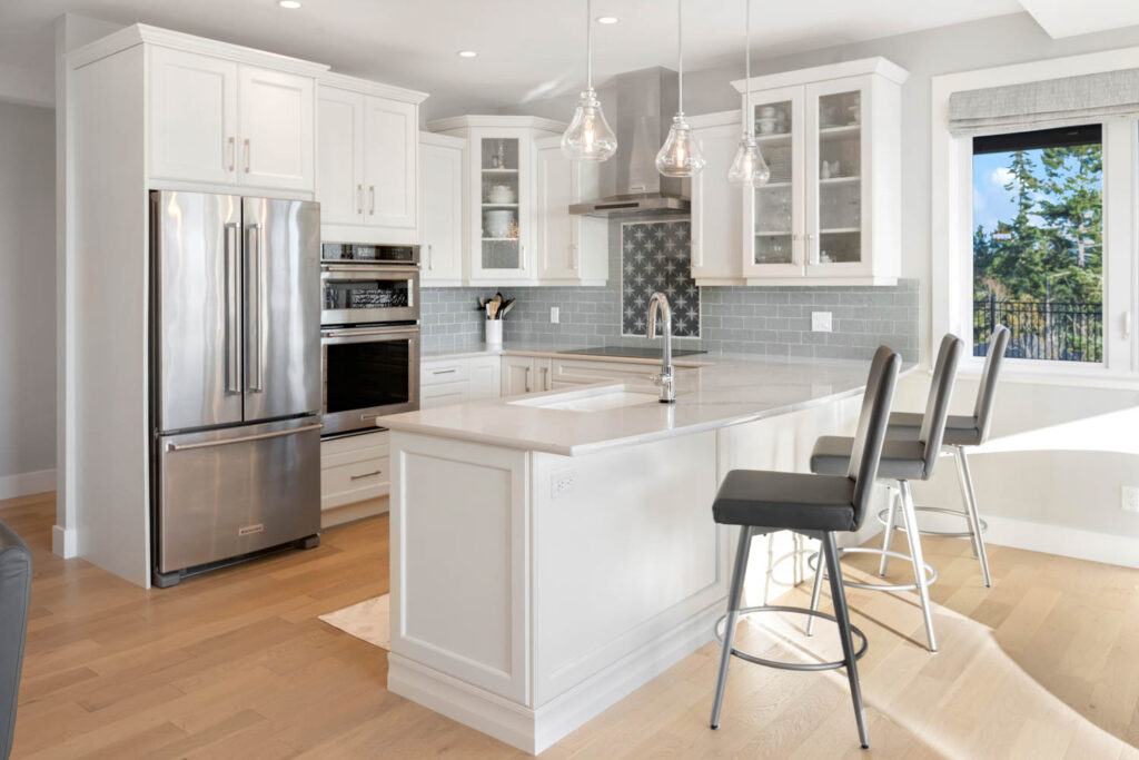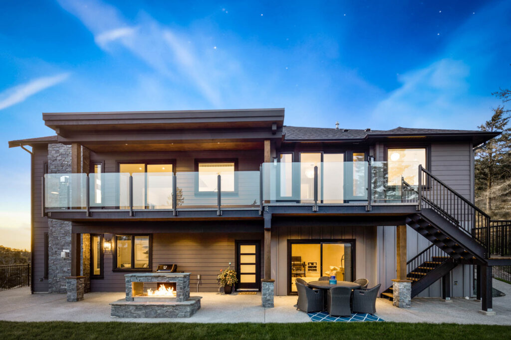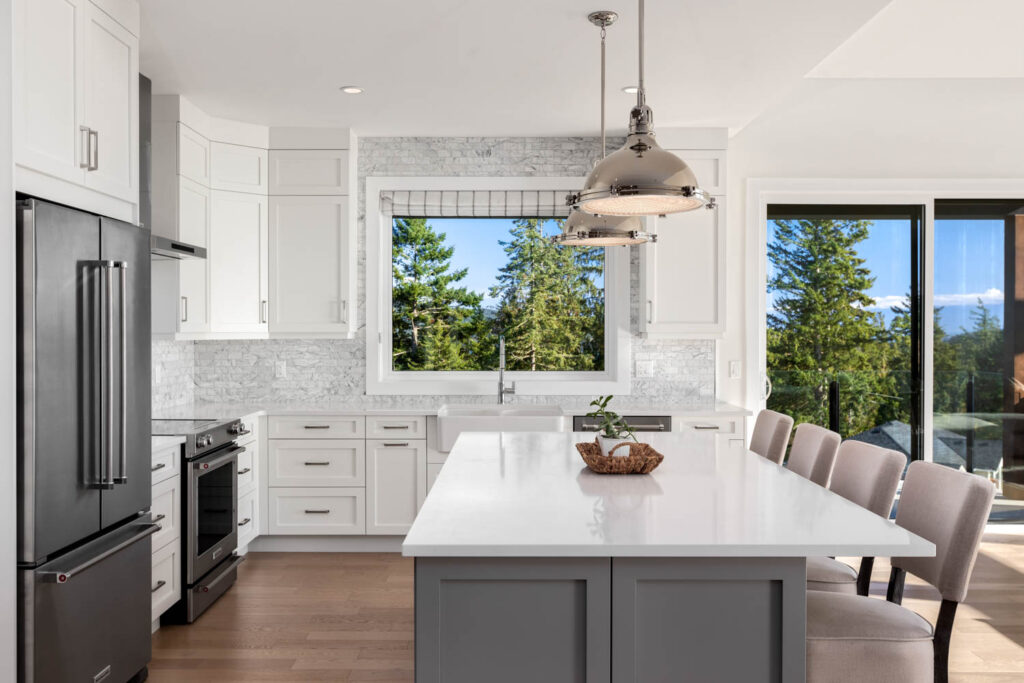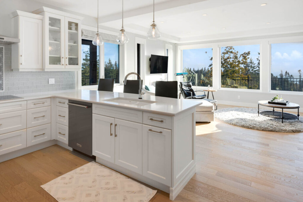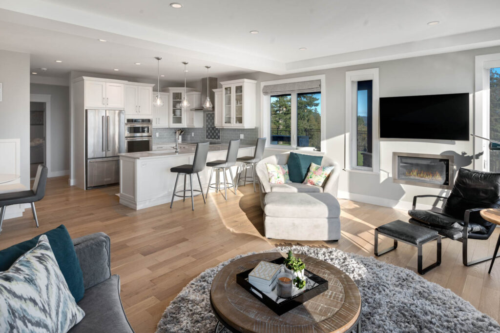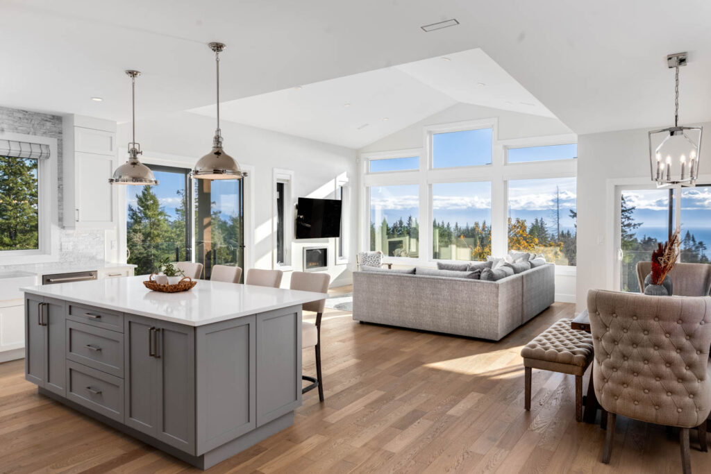 This split-level custom home features an open concept main floor with a bright living room, modern kitchen, and large windows letting in plenty of natural light and showcasing the great view.