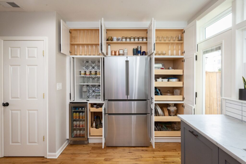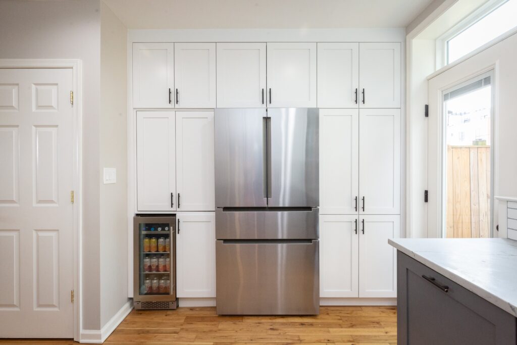 We demolished a two-story masonry flue and installed a steel beam along the back masonry wall to allow for an uninterrupted row of windows. Two walls of the kitchen feature floor-to-ceiling cabinetry, providing ample storage space. The new coffee and beverage station sits neatly behind recessed pocket doors, offering both practicality and minimalist design when closed.