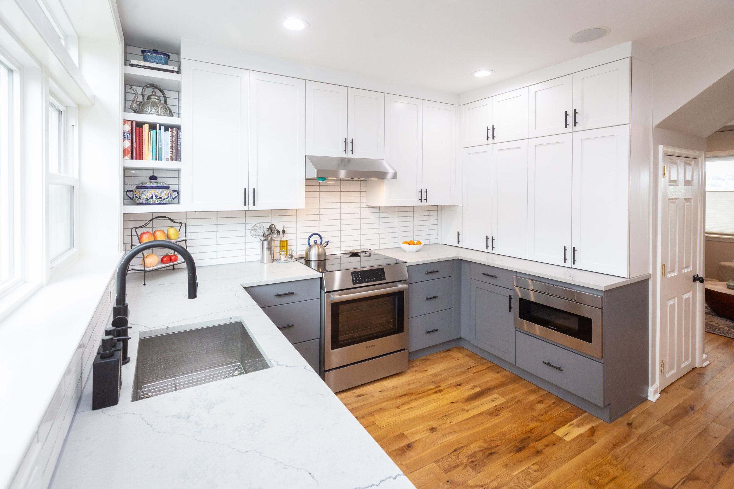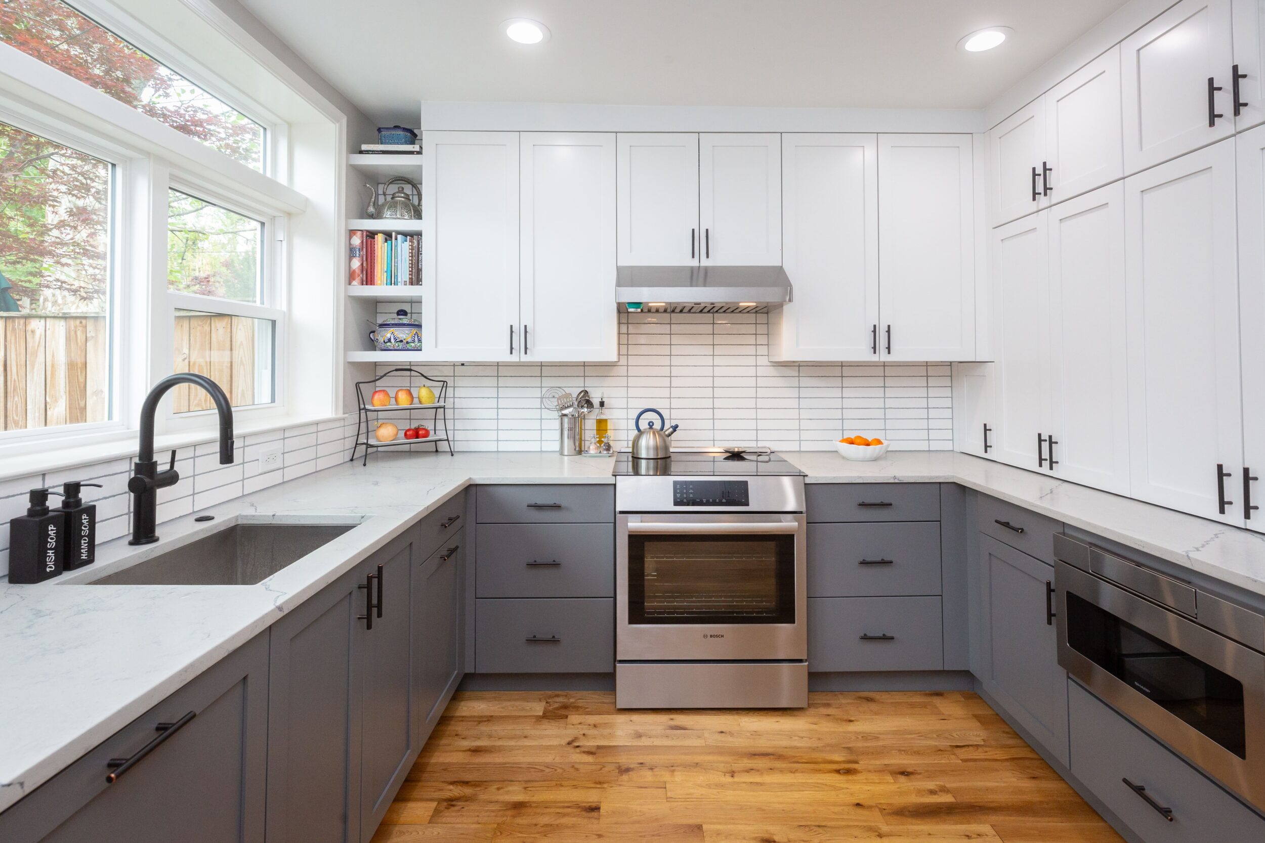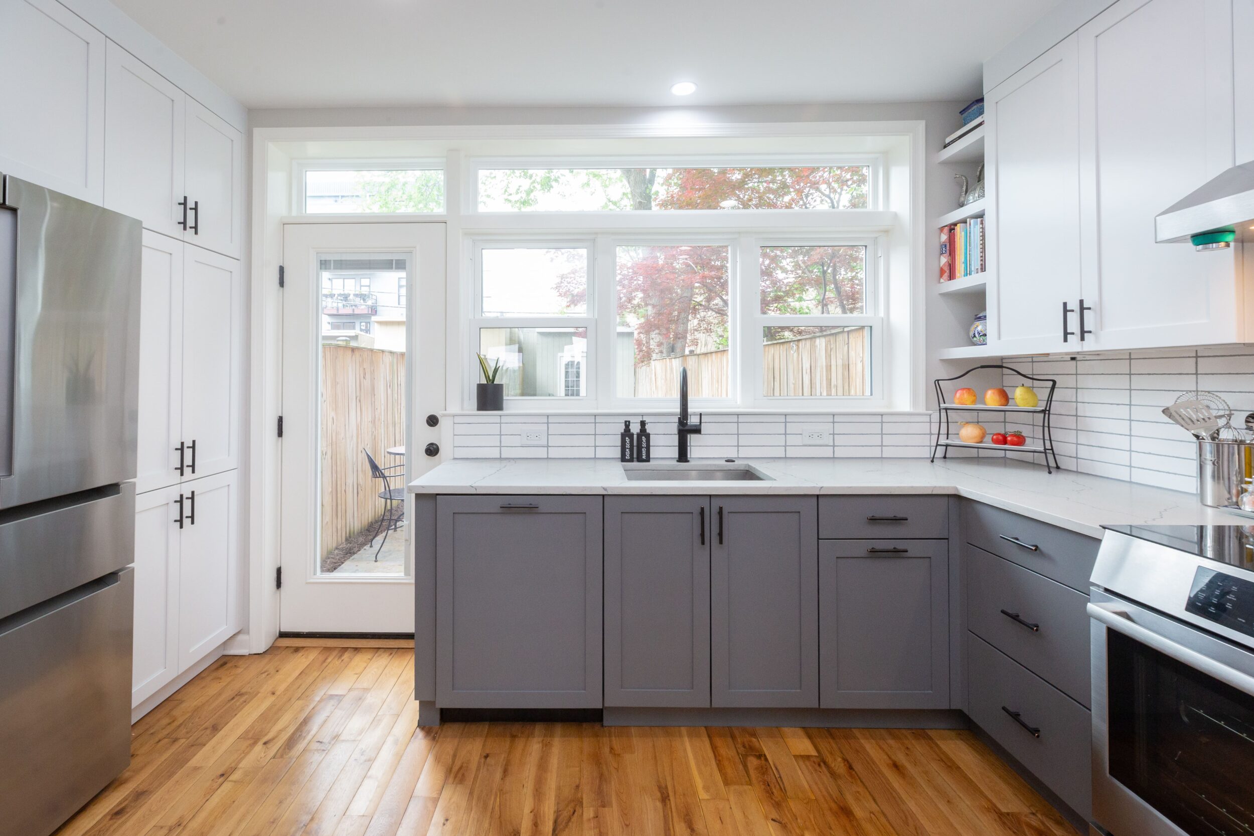 This 1,250 sq ft Capitol Hill rowhome, built in 1927, underwent a thoughtful kitchen renovation designed to blend modern function with a deep connection to nature. The homeowner, an avid gardener and home cook, envisioned a space that would maximize views of her lush backyard while significantly increasing kitchen storage, countertop surface area, and overall usability.