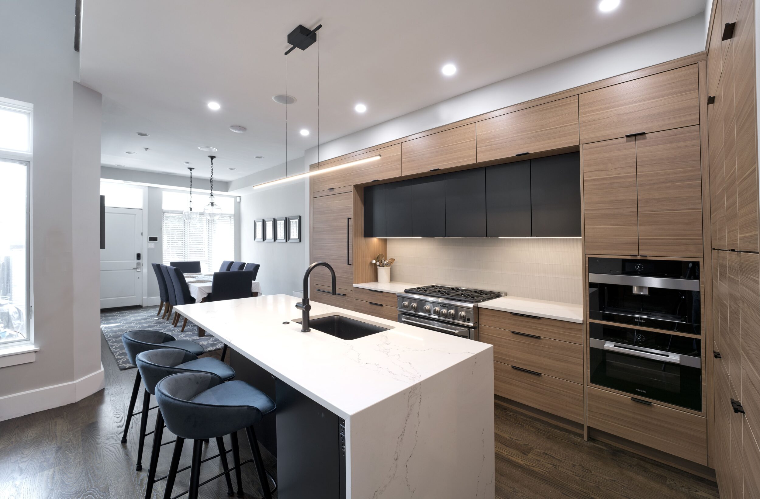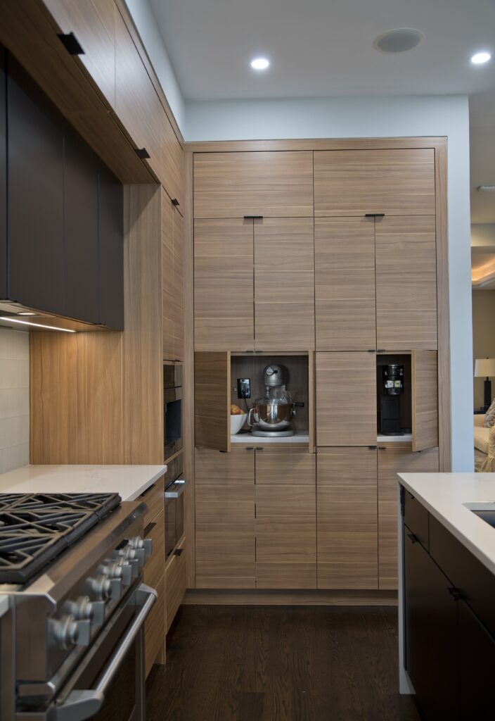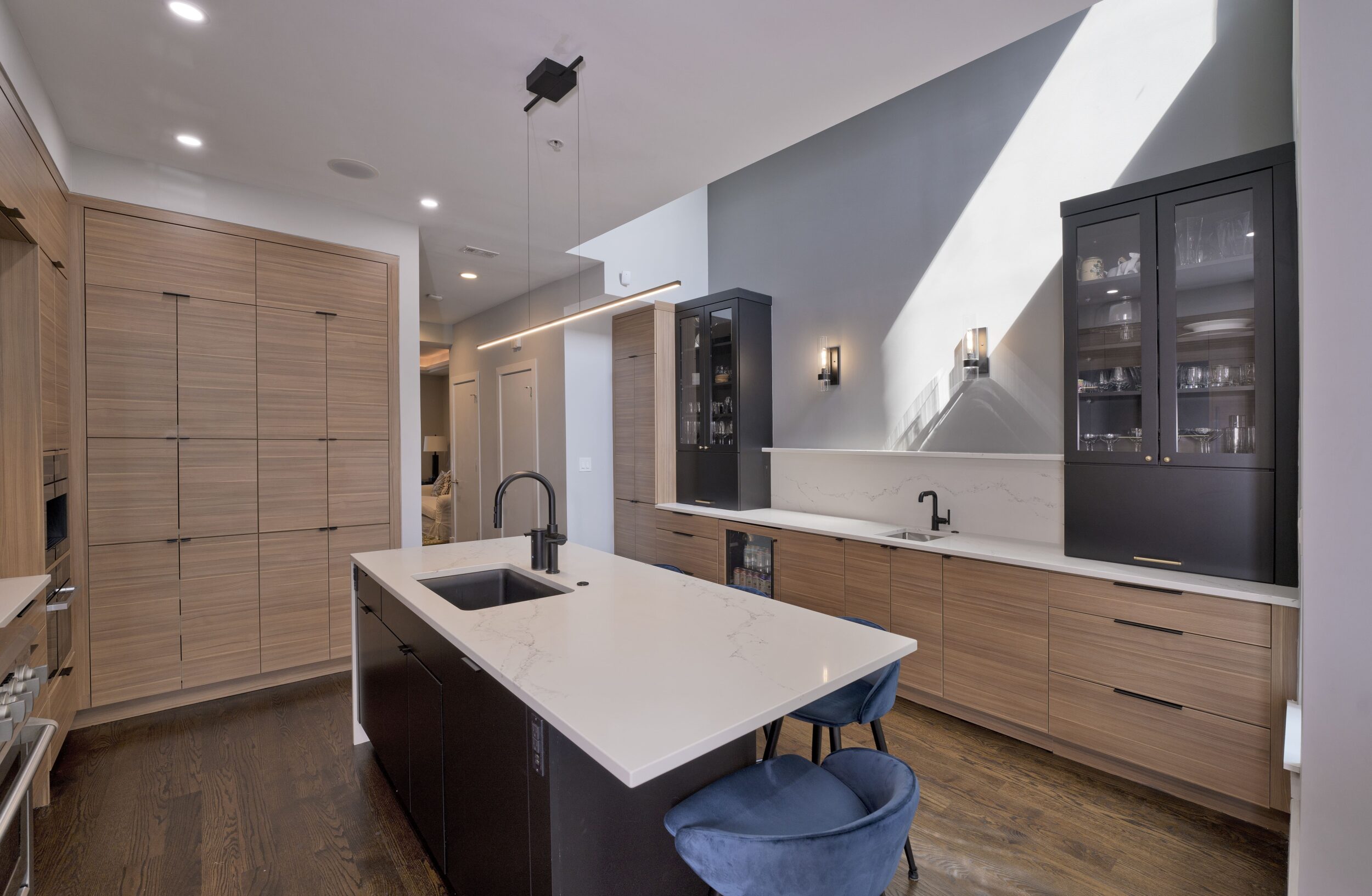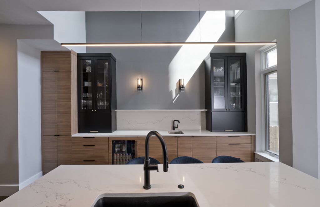 The homeowner sought a more modern aesthetic, an island with seating for four, and a spacious wet bar for entertaining. The new two-tone kitchen has a generous island with a waterfall edge, a wall of floor-to-ceiling pantry and appliance storage, built-in Miele appliances, and a statement-making wet bar flanked with furniture-style hutch cabinets.