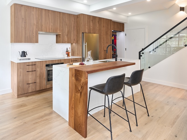 We quickly got to work. Firstly, we removed a couple of the internal walls to create an open-concept living space. We also updated the lighting plan (check out that cool chandelier above the dining room table) and all of the fixtures and finishes.
