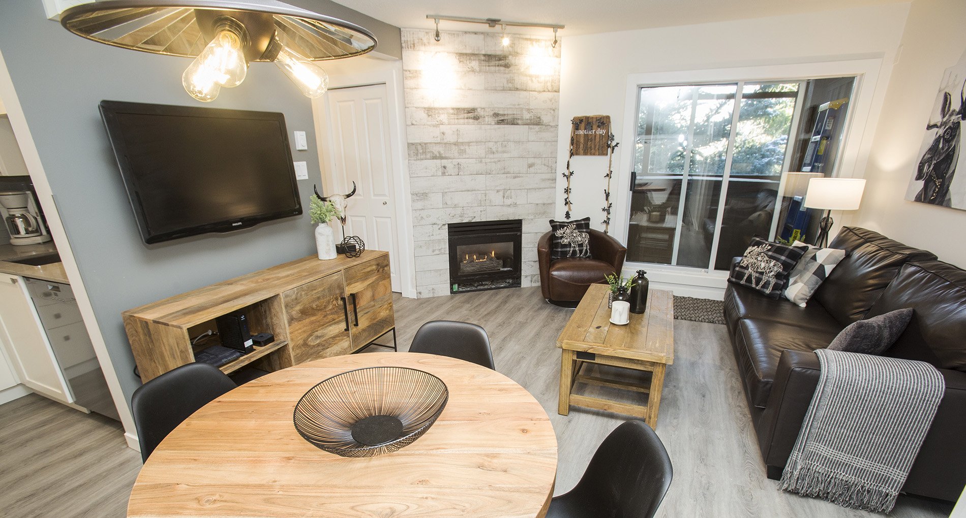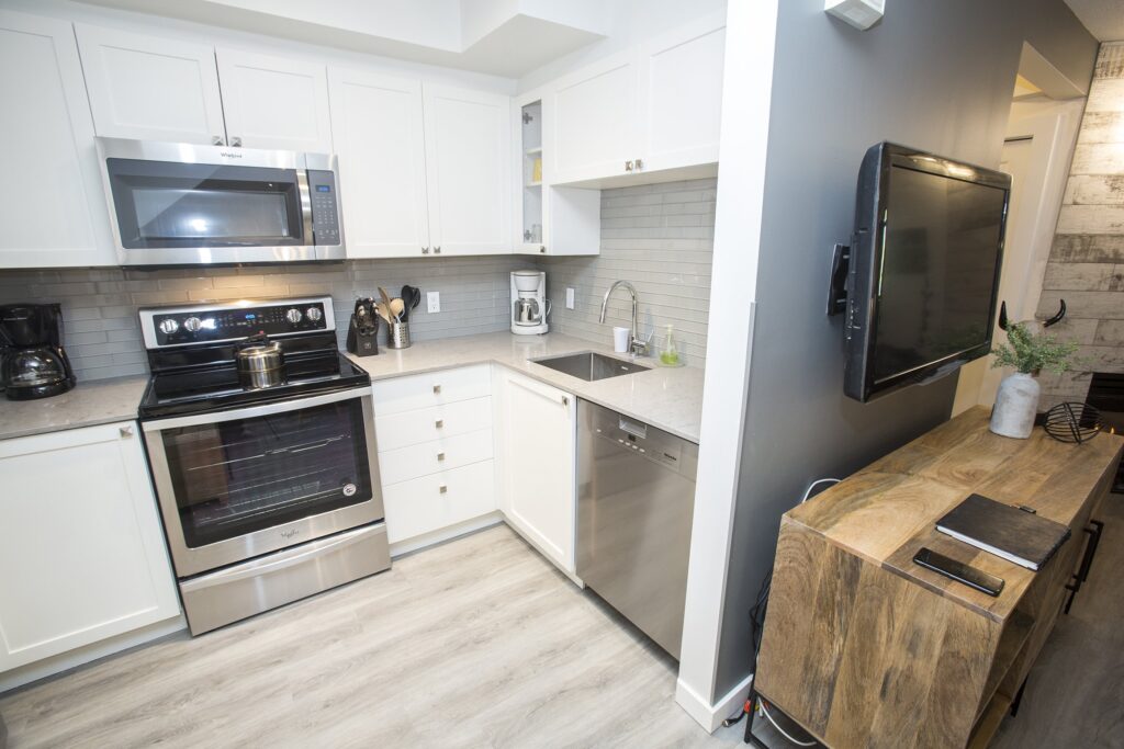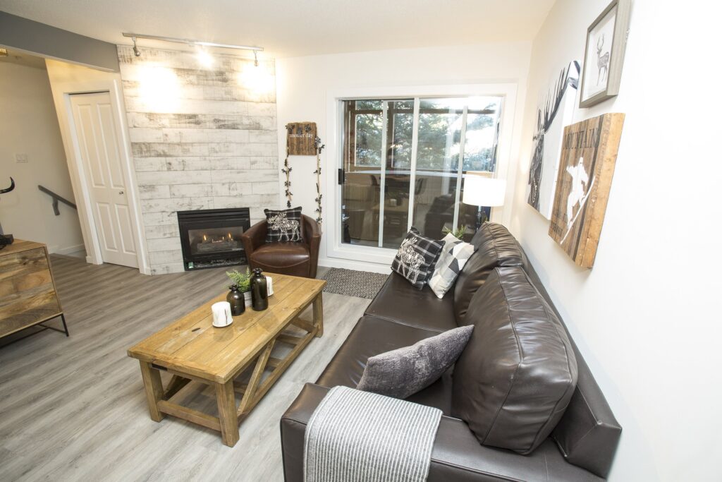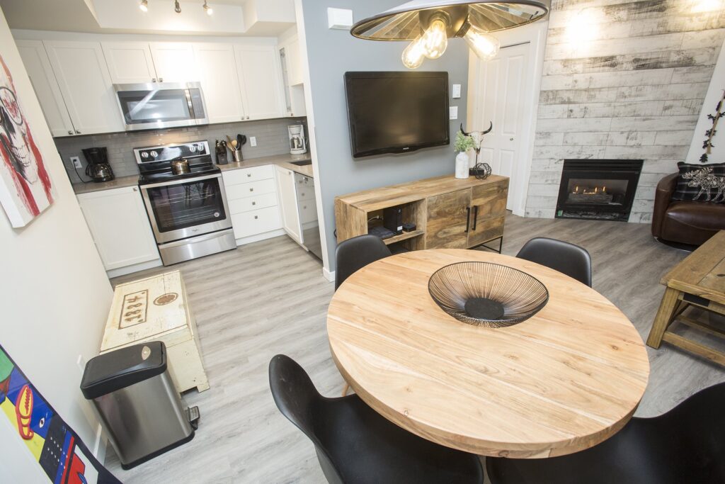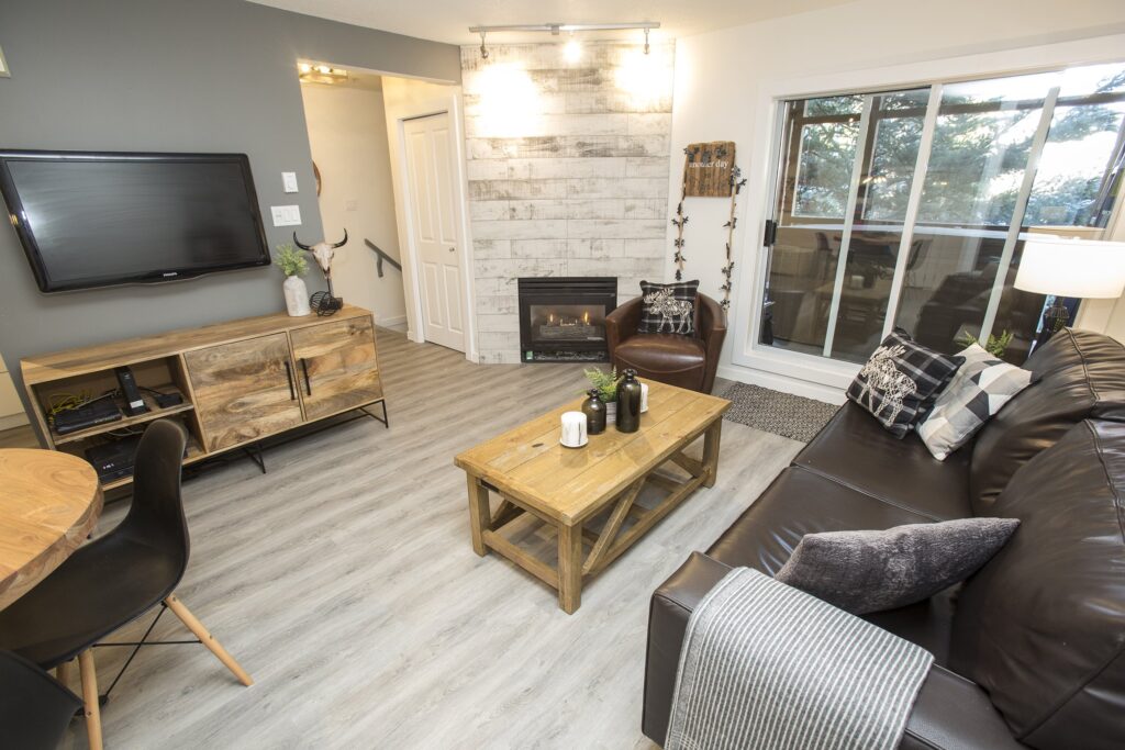 A fresh look on a classic Whistler condo. New flooring, paint and trim throughout. New counters and plumbing fixtures in the kitchen and bathroom while refinishing the existing cabinets instead of replacing them. New tile backsplash and fireplace surround with additional lighting throughout to really brighten up the unit.