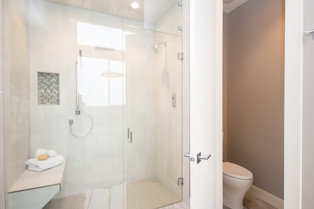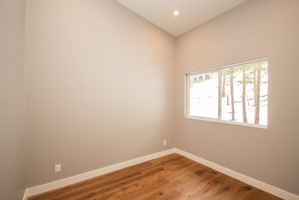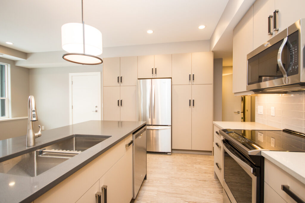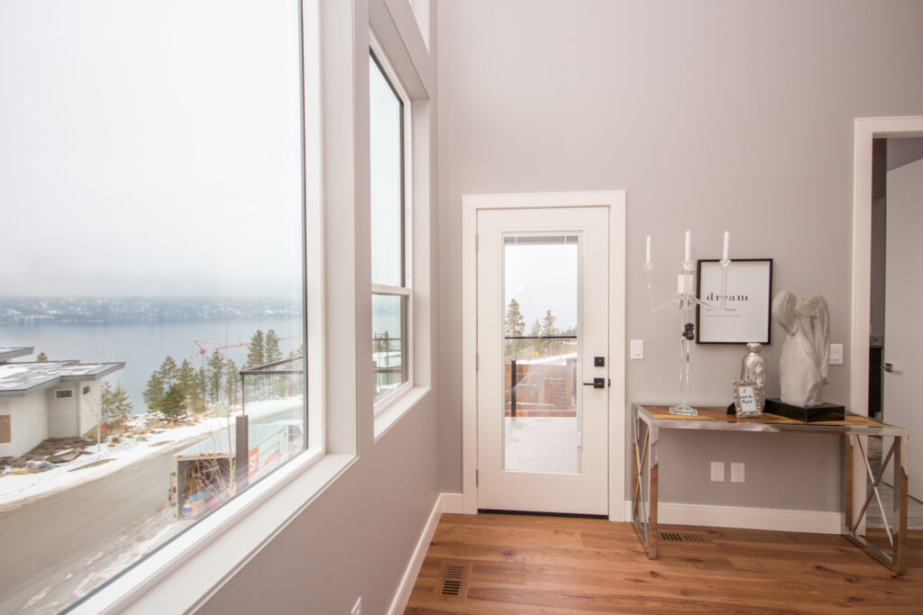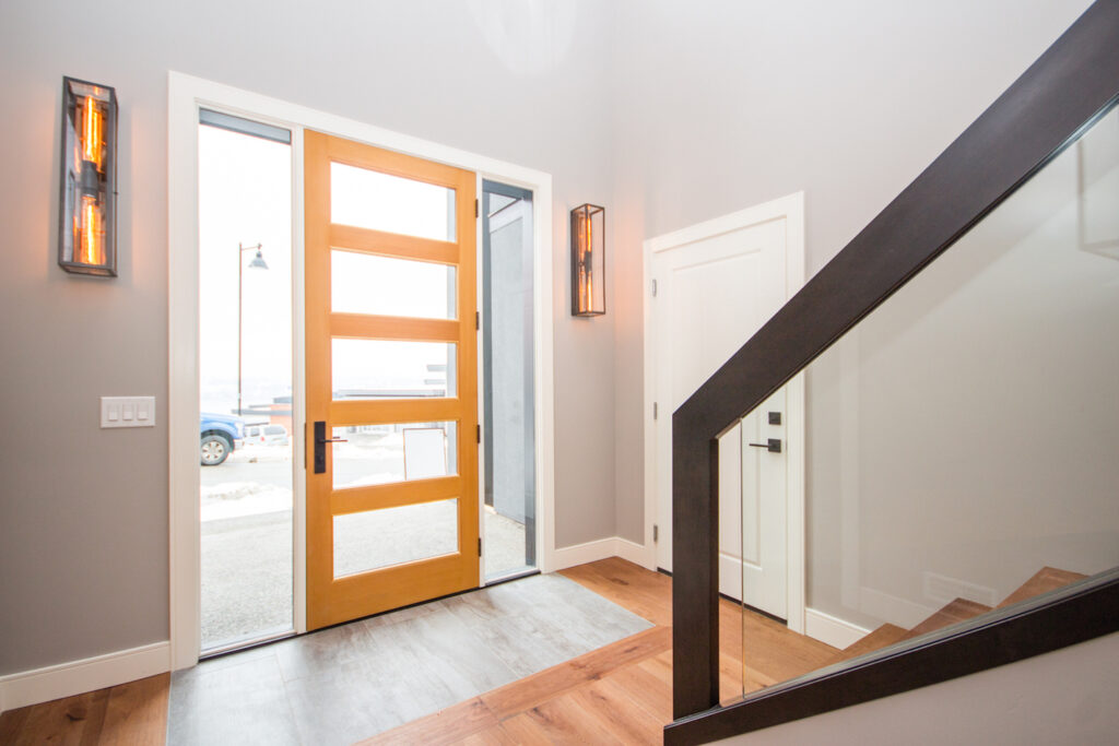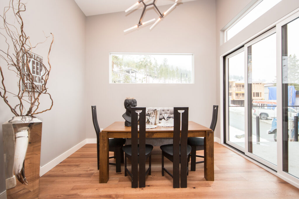 A unique modern custom home featuring an open concept main floor, modern kitchen, large windows, hardwood floors, and high-end finishes. The kitchen has an island with unique bar stool seating and rose gold pendant lights.