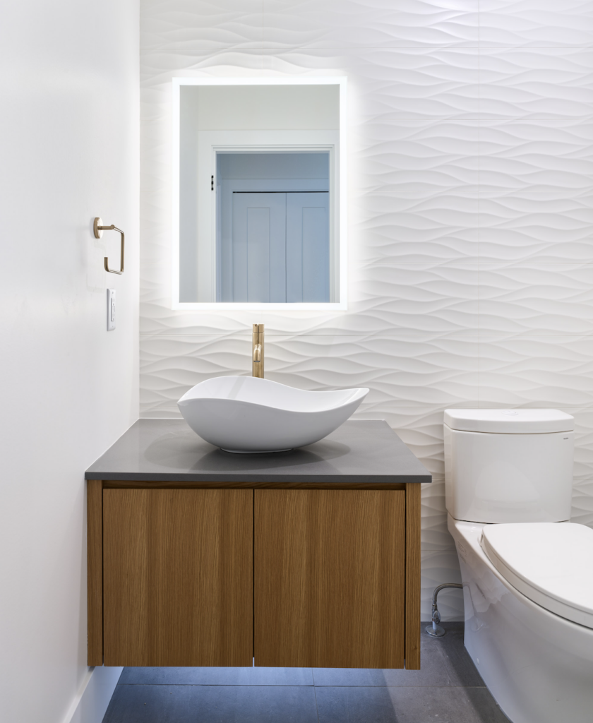 We also made upgrades to the powder room. The renovation here included two-tone millwork and under-cabinet lighting. The powder room also features motion-sensors, a back-lit mirror, a free-form vessel-sink and an irregular-patterned backsplash for texture and visual interest.