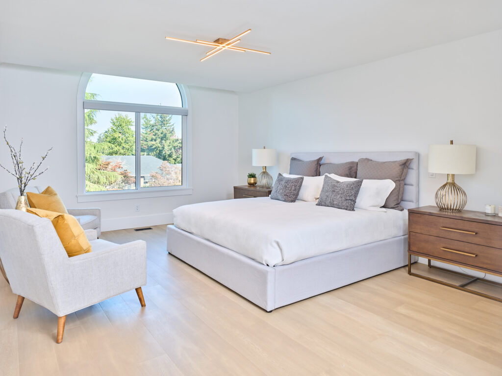 The home owners wanted the primary suite to be spacious and minimalistic, creating a peaceful and relaxing ambiance. The room now features a king-sized bed, nightstands and two arm-chairs. The chairs are perfect for savouring morning coffee and for taking in the forest view.