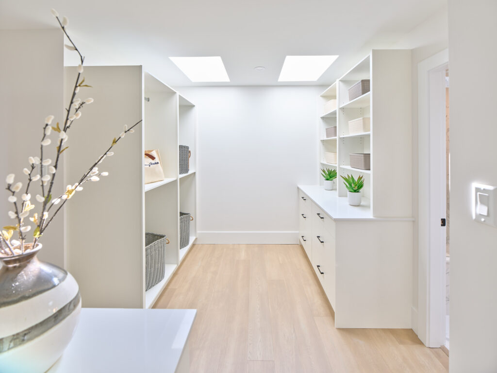 We transformed half of that over-the-garage space into a envy-worthy walk-in closet. It now includes an accessory island and plenty of custom storage solutions for everything from clothes, to shoes to handbags. This room also features two skylights, again adding natural light. Not something you find in most walk-in closets.