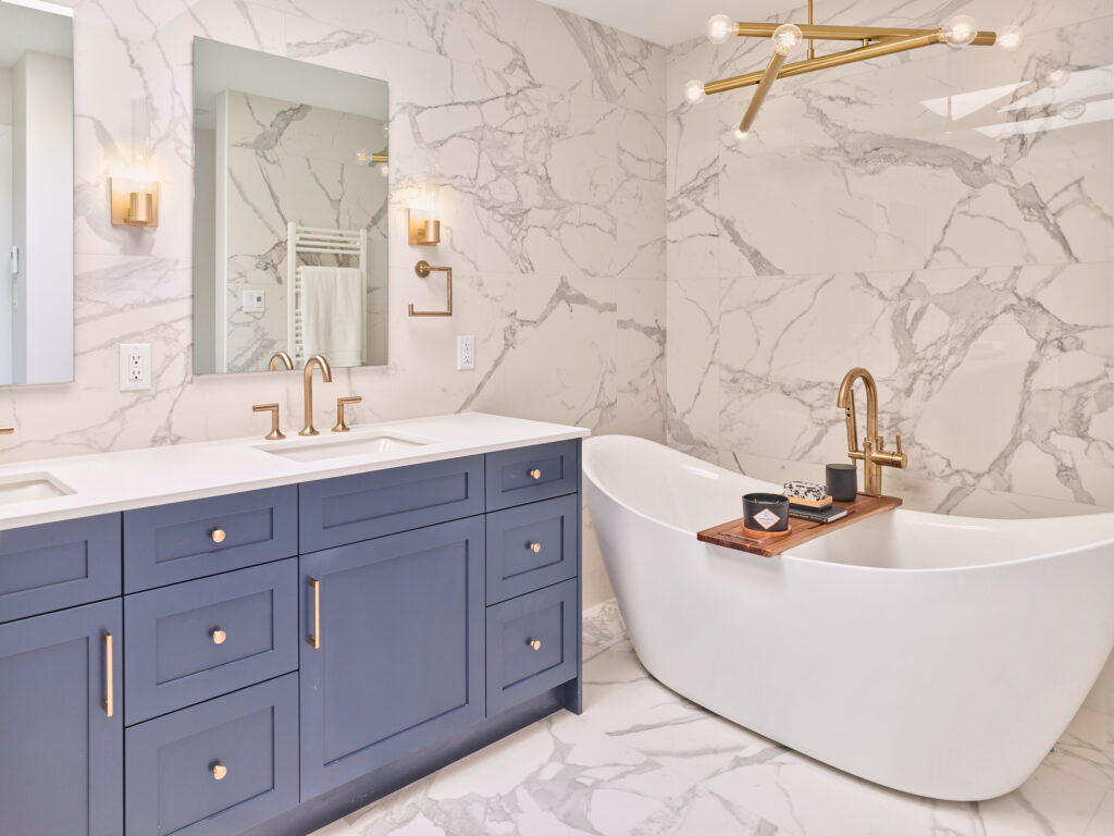 The existing 300-square-foot ensuite was above the garage and it felt very cold and damp. The newly-configured ensuite now features large format porcelain-tiles on both the floor and the walls. Floating mirrors are located above the his and hers sinks, which are are nestled into a Shaker-style cabinet.