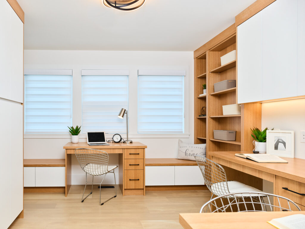 With the clients often working from home, the office area needed an update as well. We tech-loaded the space to include USB, data ports and extra electrical, making it extremely functional. We also added two-tone millwork with under-cabinet ribbon-lighting and built-in solid oak desks.