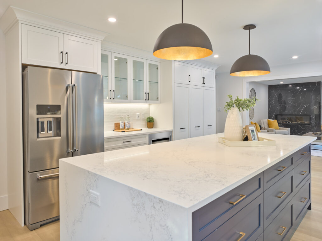 One big change was the island. We expanded it to include a two-sided eating-bar. The single-slab white-quartz surface now matches the perimeter counter area, creating cohesion.