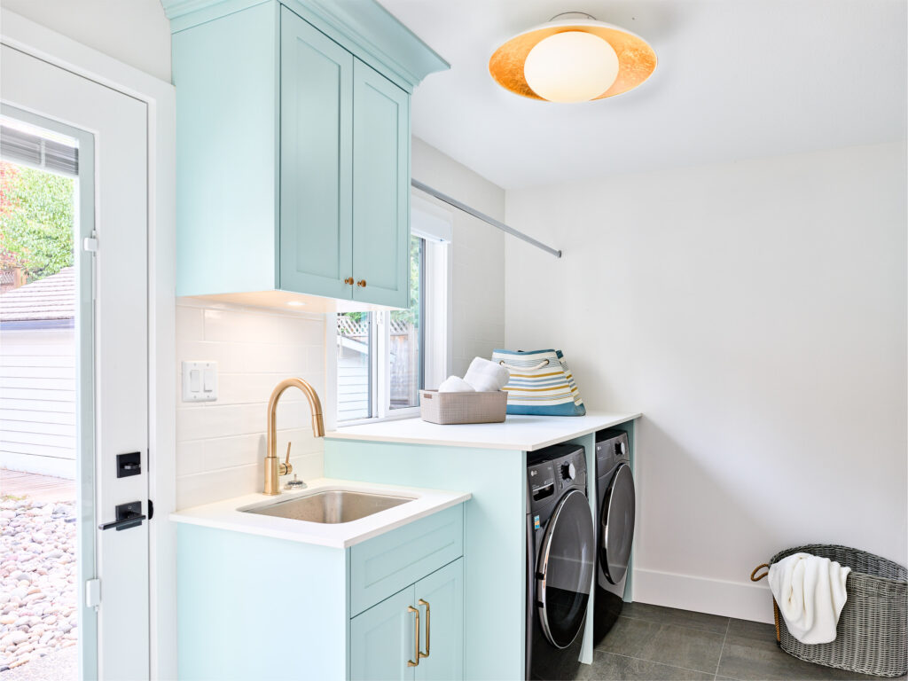 The laundry room may not be the most visible room in the house, but it is definitely well-used. This beautiful laundry room/mud room got a new washer dryer, a prep sink, large-format floor-tiling, tidewater-blue cabinetry and puck-lighting. It’s now both functional and Pinterest worthy!