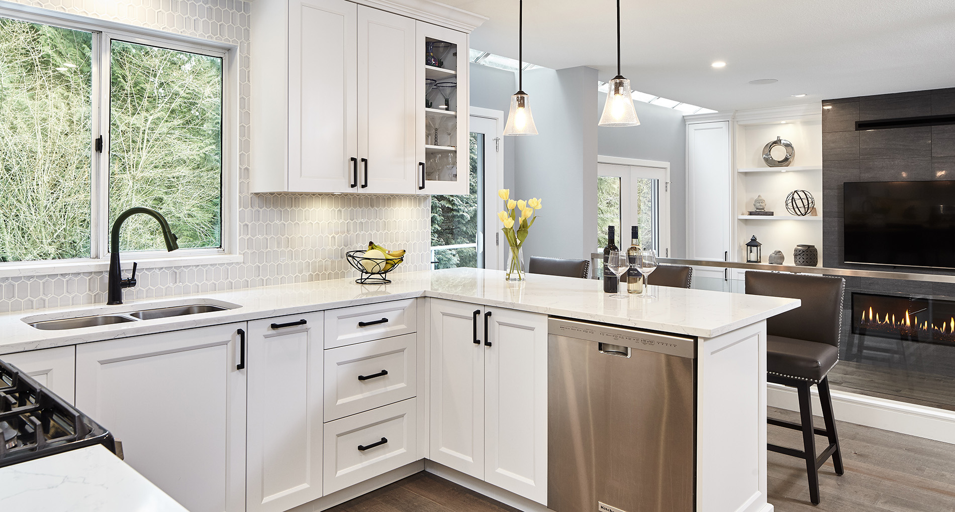 This modern home renovation designed by Sheri Lemire at SDL Designs features an open concept kitchen and family room with stainless steel appliances, high-end finishes, tile done by Mira Flooring, and a Cozy heat 50 linear fireplace by Urban Fireplace. Inline Glasscraft did the glass staircase in the entry and the double sliding shower doors in the master bathroom. Ocean Pacific Lighting did the fantastic luminated mirrors.