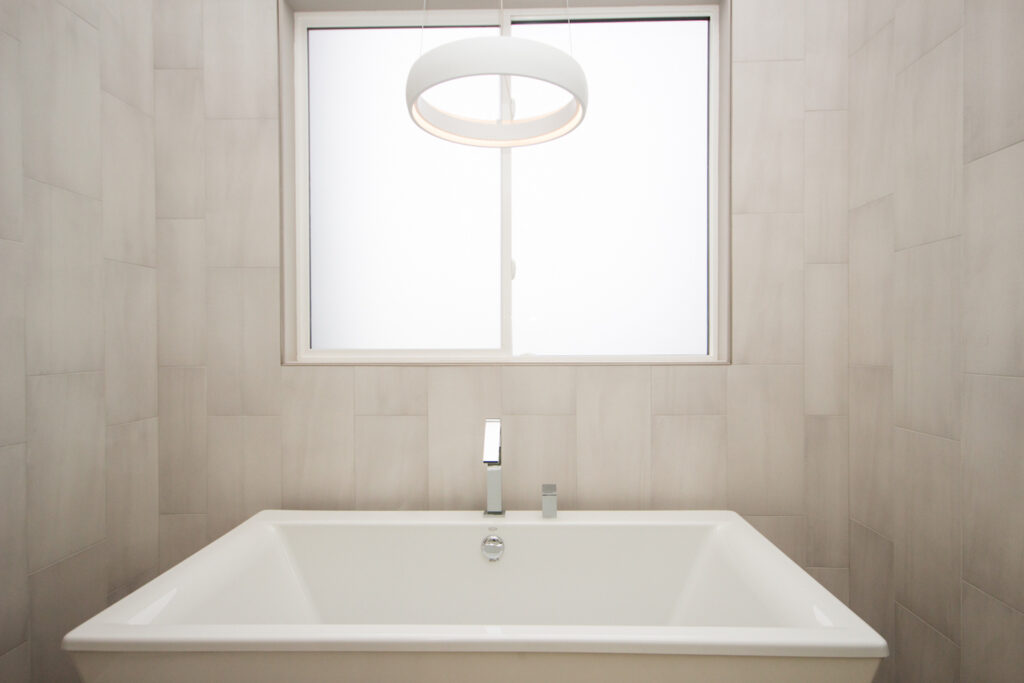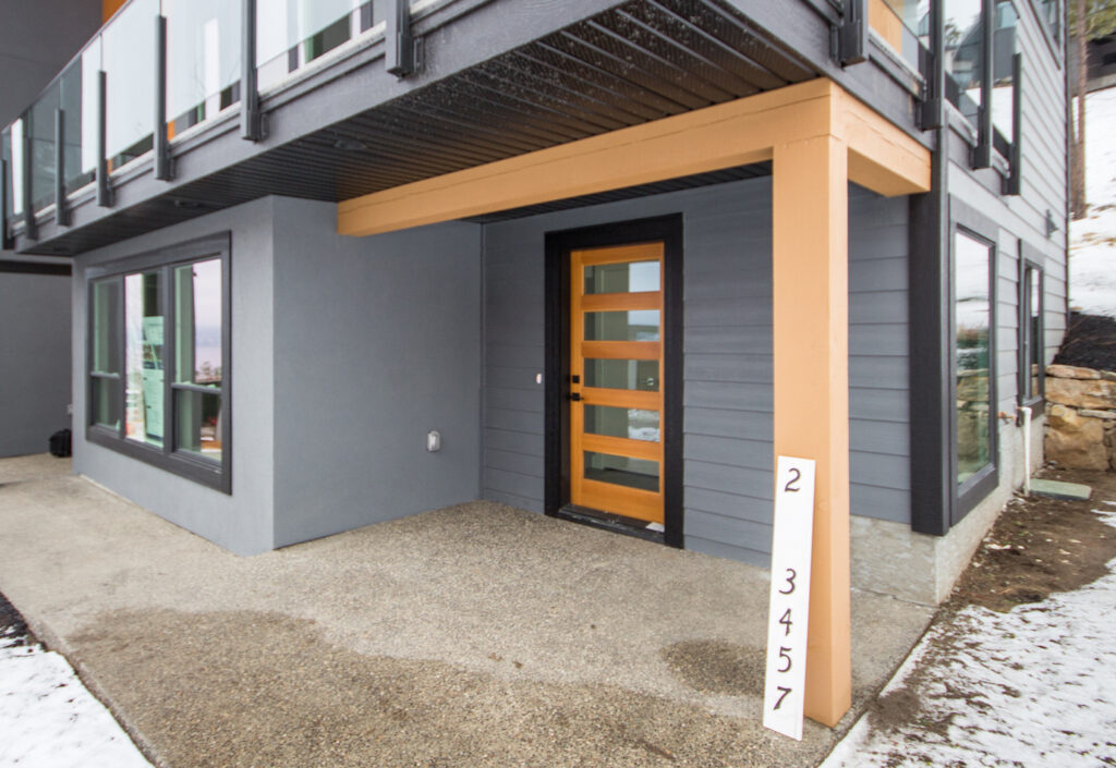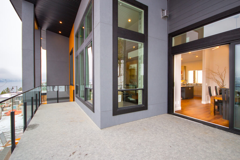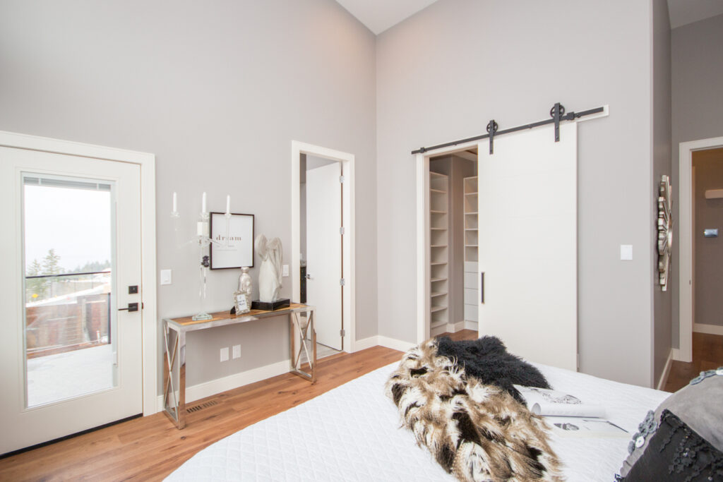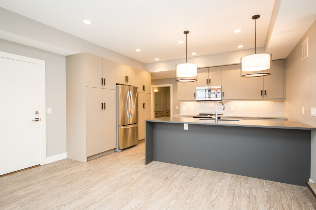 An unique modern custom home featuring an open concept main floor, modern kitchen, large windows, hardwood floors, and high-end finishes. The kitchen has an island with unique bar stool seating and rose gold pendant lights.