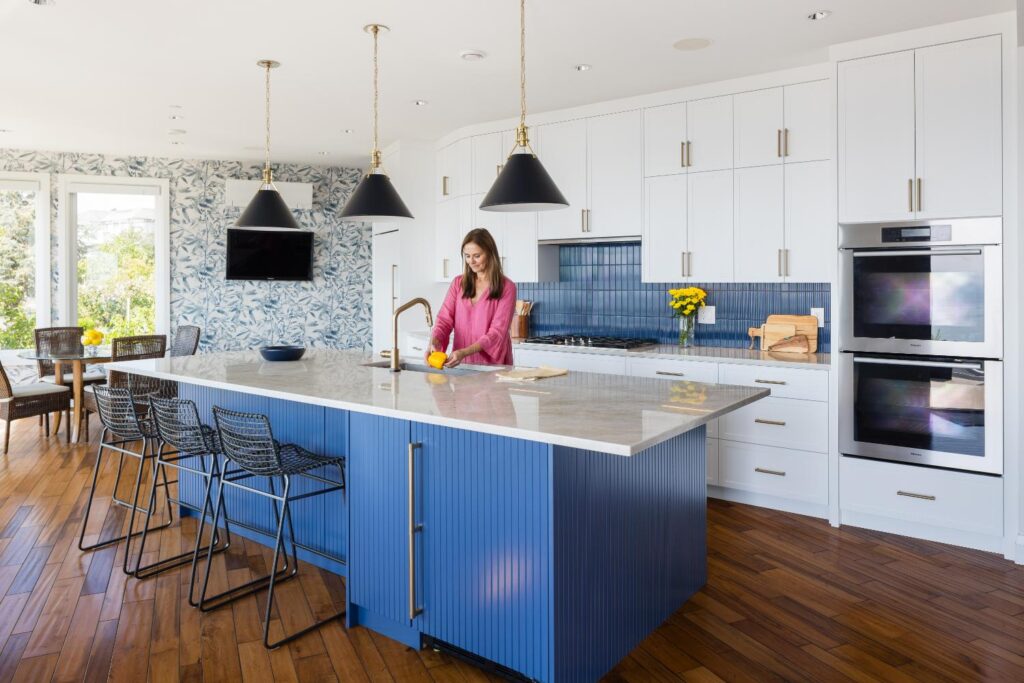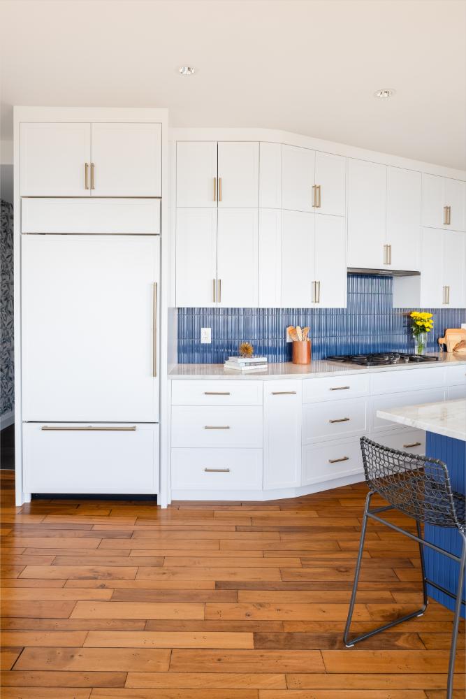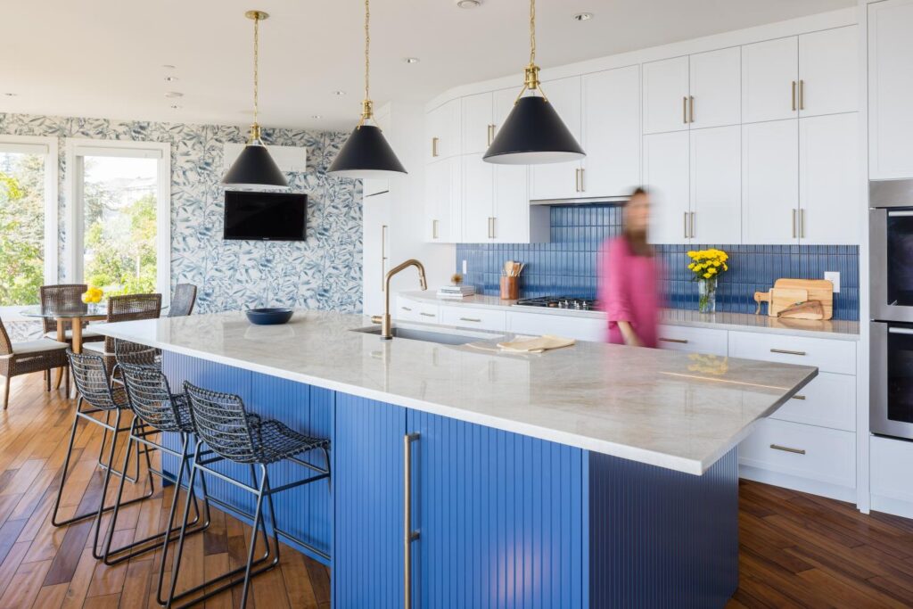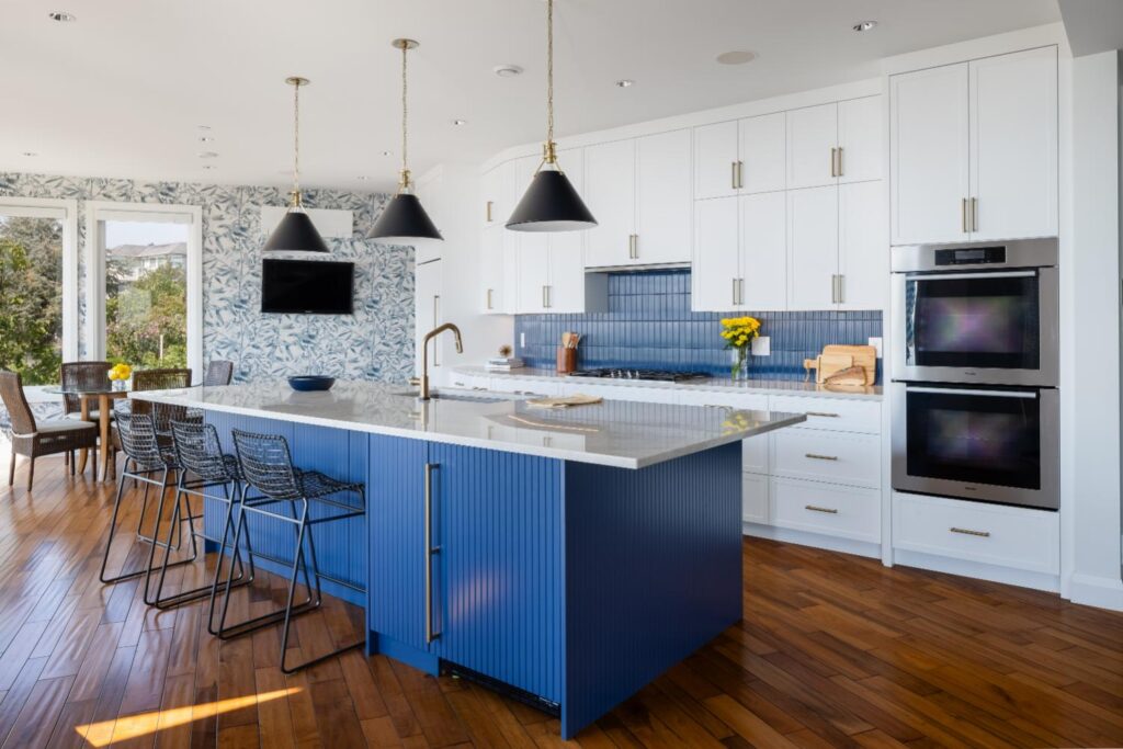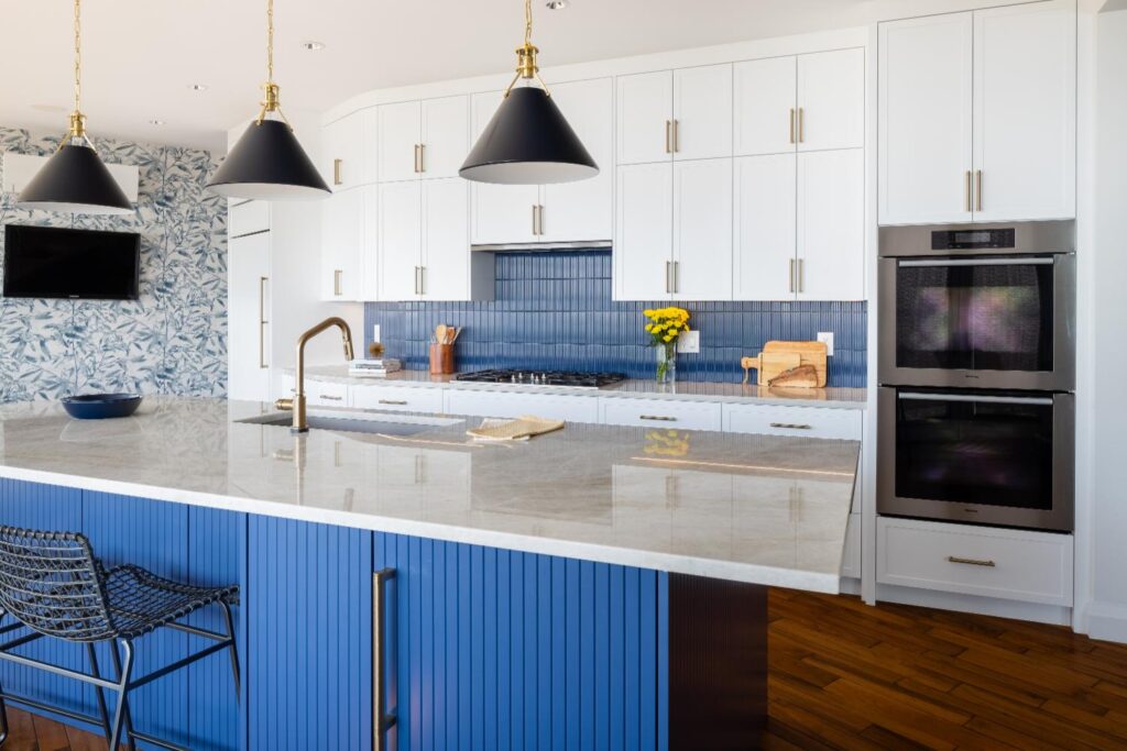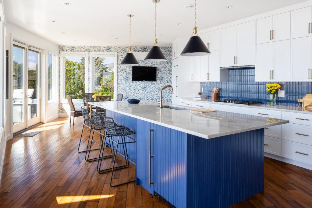 White cabinetry accented with blue backsplash and island