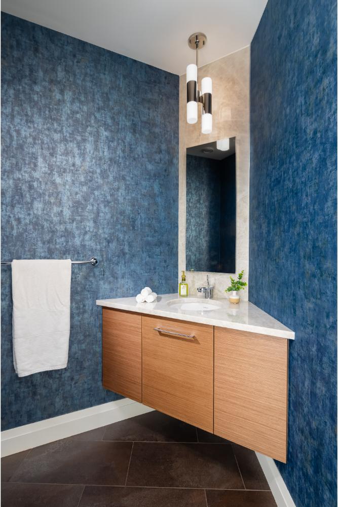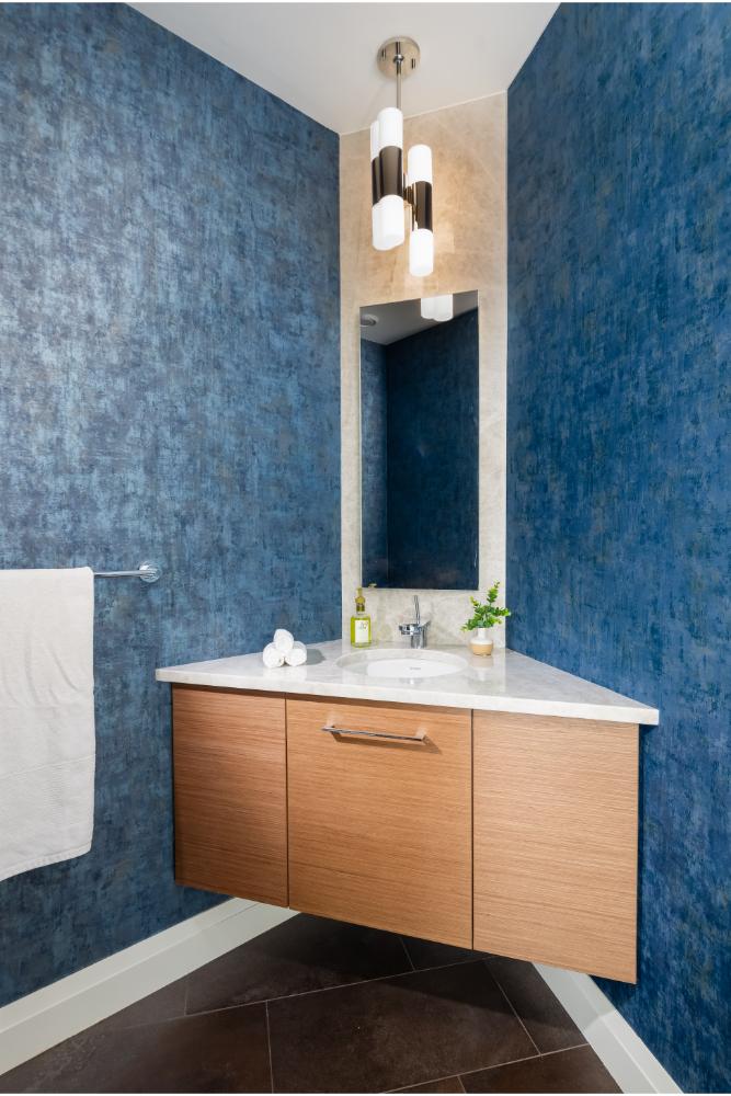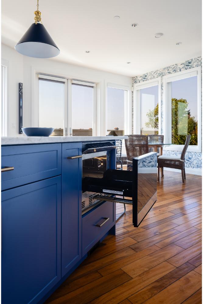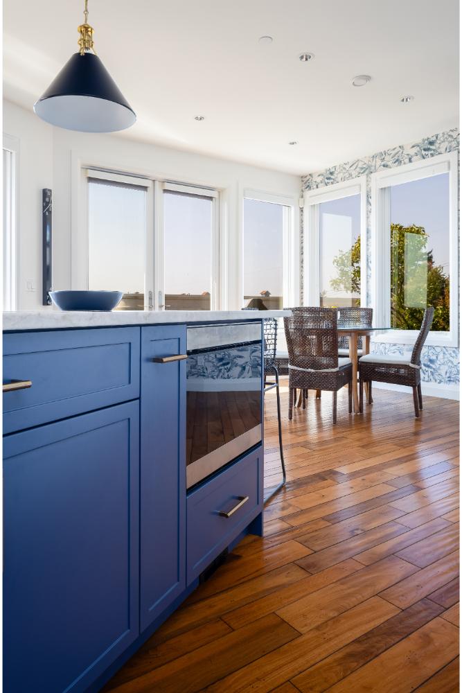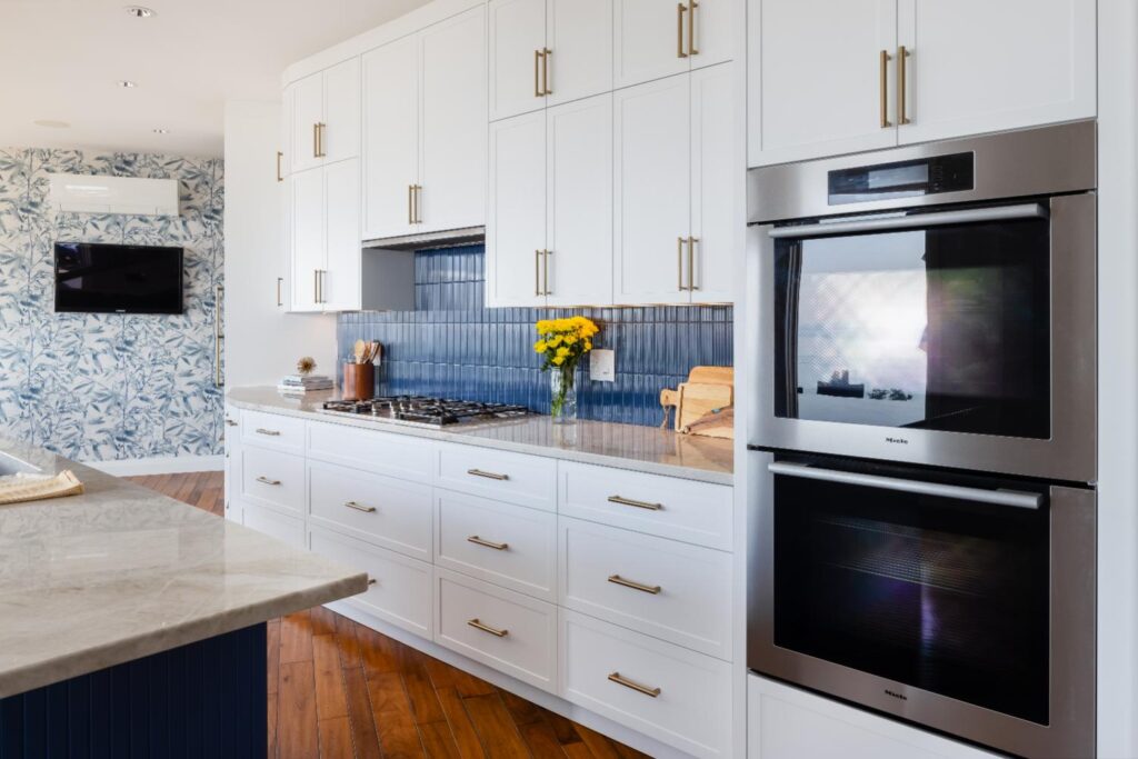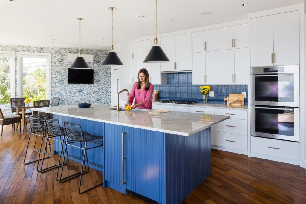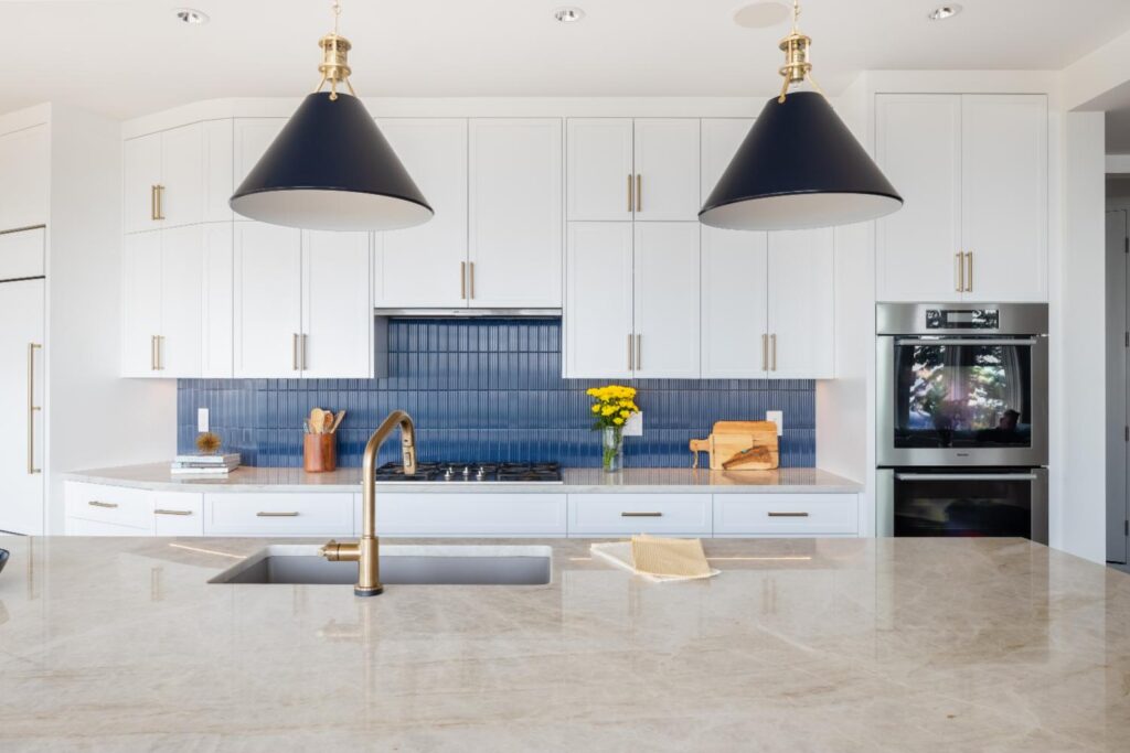 White cabinetry accented with blue backsplash and island