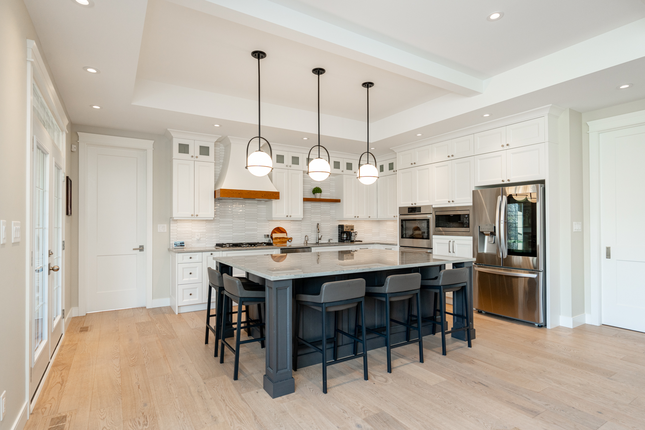 This custom home was designed with a busy family of five, blending functionality, comfort, and a touch of fun. Each child has their own ensuite bathroom, and the two children share a secret door hidden in their closets that connects their bedrooms, a favourite feature. A three-season room offers the perfect spot for the parents to unwind while the kids play outside.